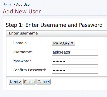 Click Finish to complete. The new user appears in the Users list. You can change the user's password, assign it different roles or delete it.