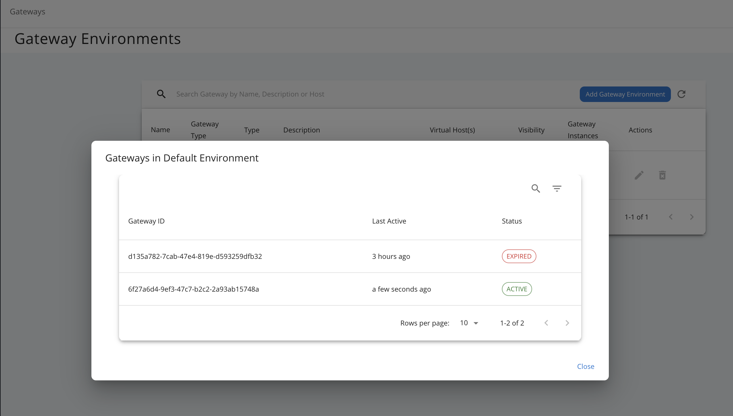 Once the Gateway environment is set up, you can observe the active Gateway instances registered under the created environment, as shown in the image below. If a Gateway instance shows an expired status, it means the instance has not sent a heartbeat signal within the expected time interval and is considered inactive or unreachable.