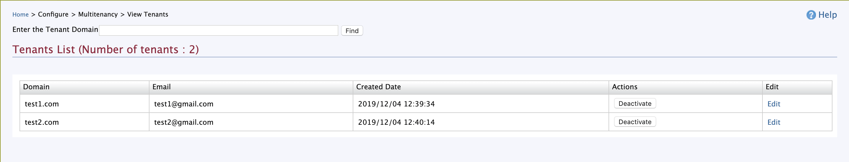 After saving, the newly added tenant appears in the Tenants List page as shown below. Click View Tenants in the Configure tab of the management console to see information of all the tenants that currently exist in the system. Enter the domain name in the Enter the Tenant Domain parameter and click Find to find the newly added tenant in the list.
