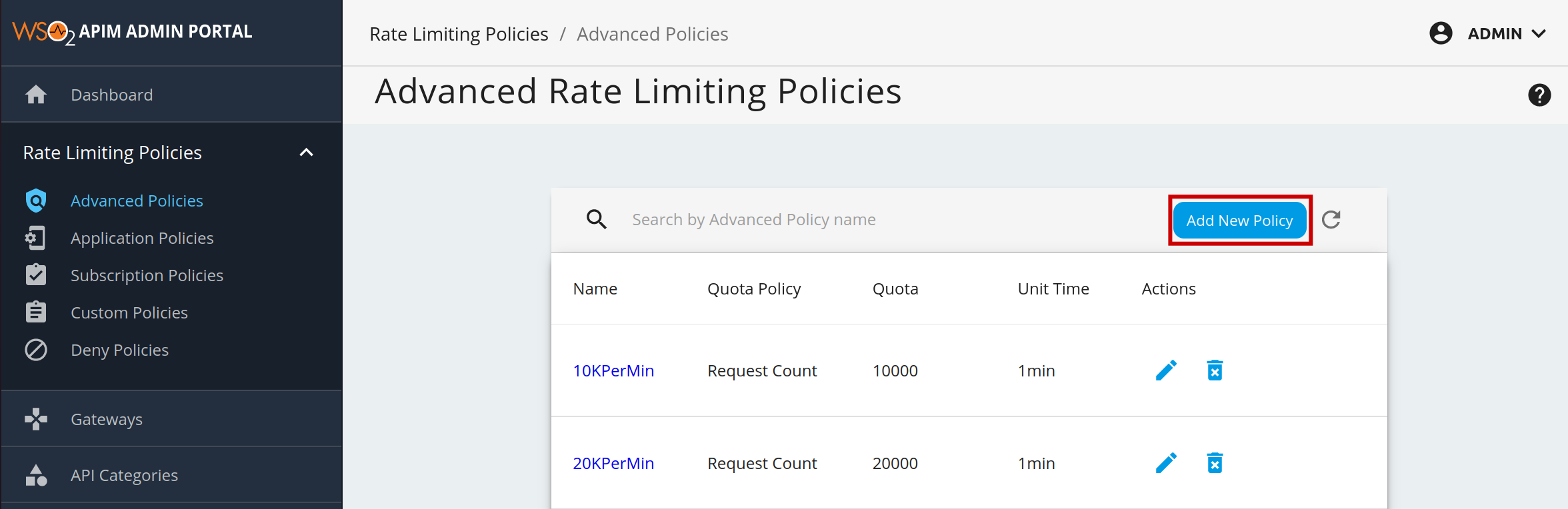 https://localhost:9443/adminand your admin credentials (admin/admin by default). - Click Advanced Throttling under the Rate Limiting Policies section to see the set of existing rate limiting tiers.