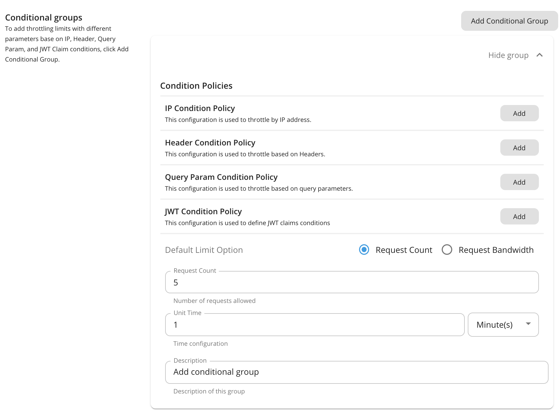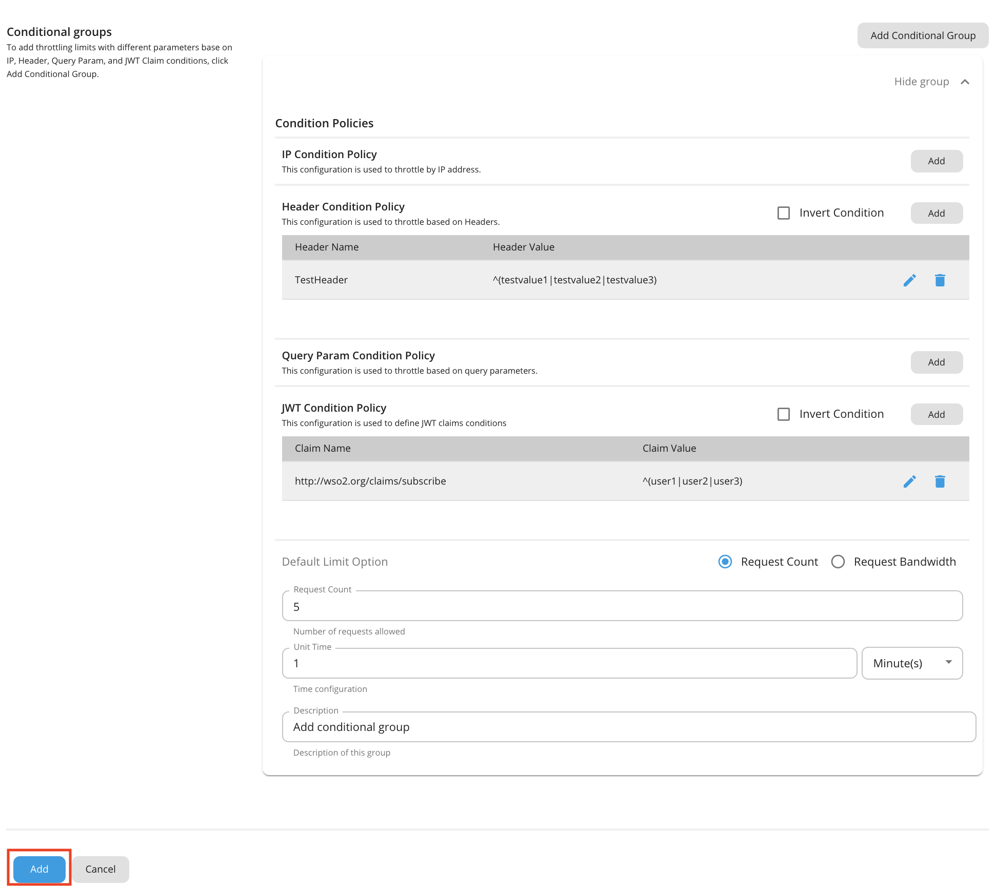 [apim.throttling] enable_header_based_throttling = true enable_jwt_claim_based_throttling = true enable_query_param_based_throttling = trueYou can add a description about the condition group by clicking Description under Condition Group.