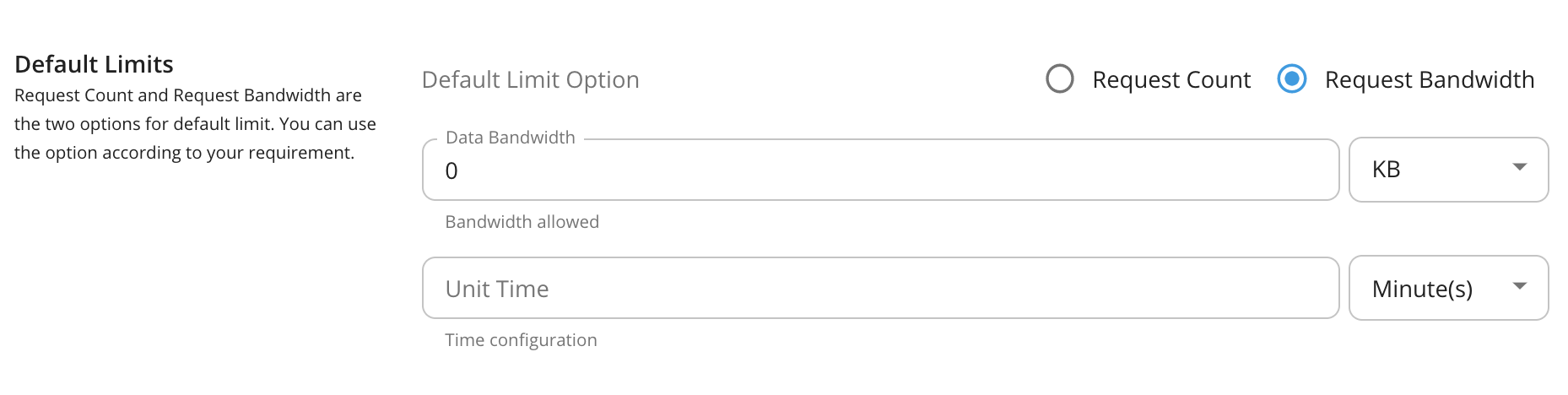 Request Count and Request Bandwidth are the two options for default limit. You can use the option according to your requirement. Request Count is commonly used as the limiting option for API requests. If you are using APIs for File sharing and Data transmission you can use Request Bandwidth as your default limiting option.