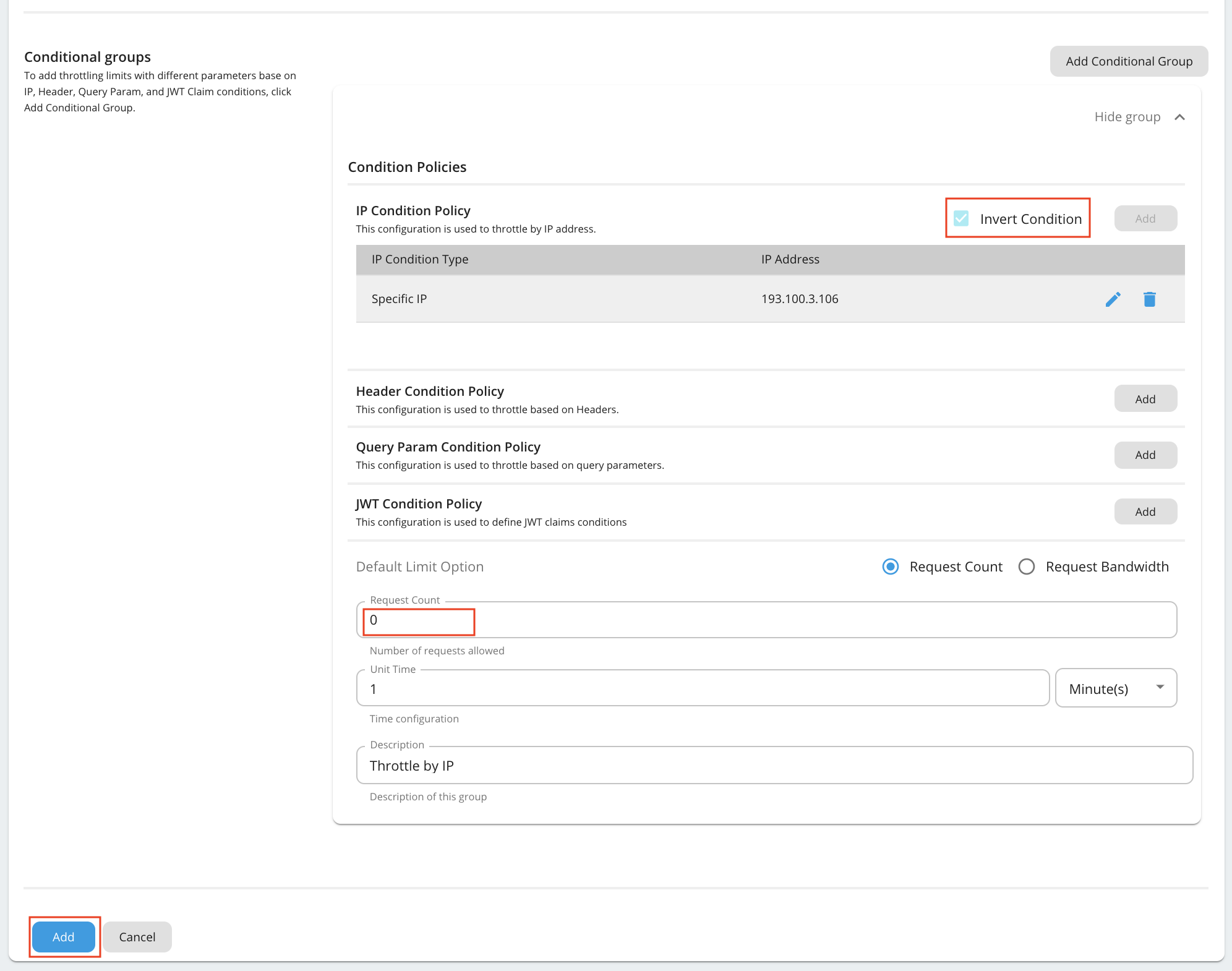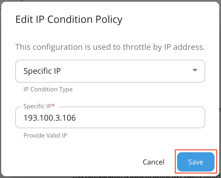 Condition Description value IP Condition Allows you to set a rate limiting limit for a specific IP address or a range of IP addresses. Header Condition Allows you to set a rate limiting limit to specific headers and parameters. Query Param Condition Allows you to set a rate limiting limit to specific query parameters. JWT Claim Condition Allows you to set a rate limiting limit to specific claims. Note