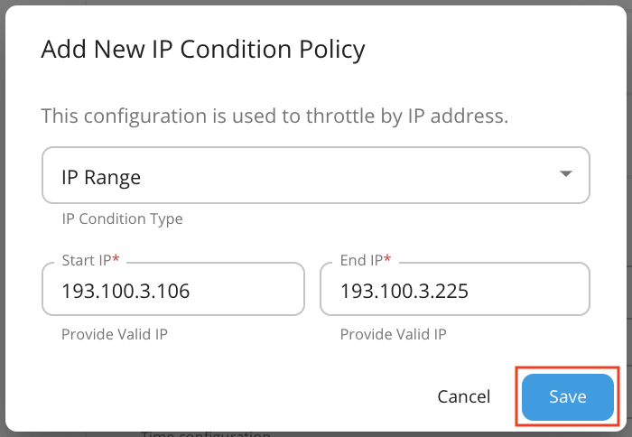 In the above configuration we are allowing a Specific IP address to access an API. You can allow a range of IPs as well by selecting IP Range for the IP Condition Type in the Conditional Group and specifying the range as follows.