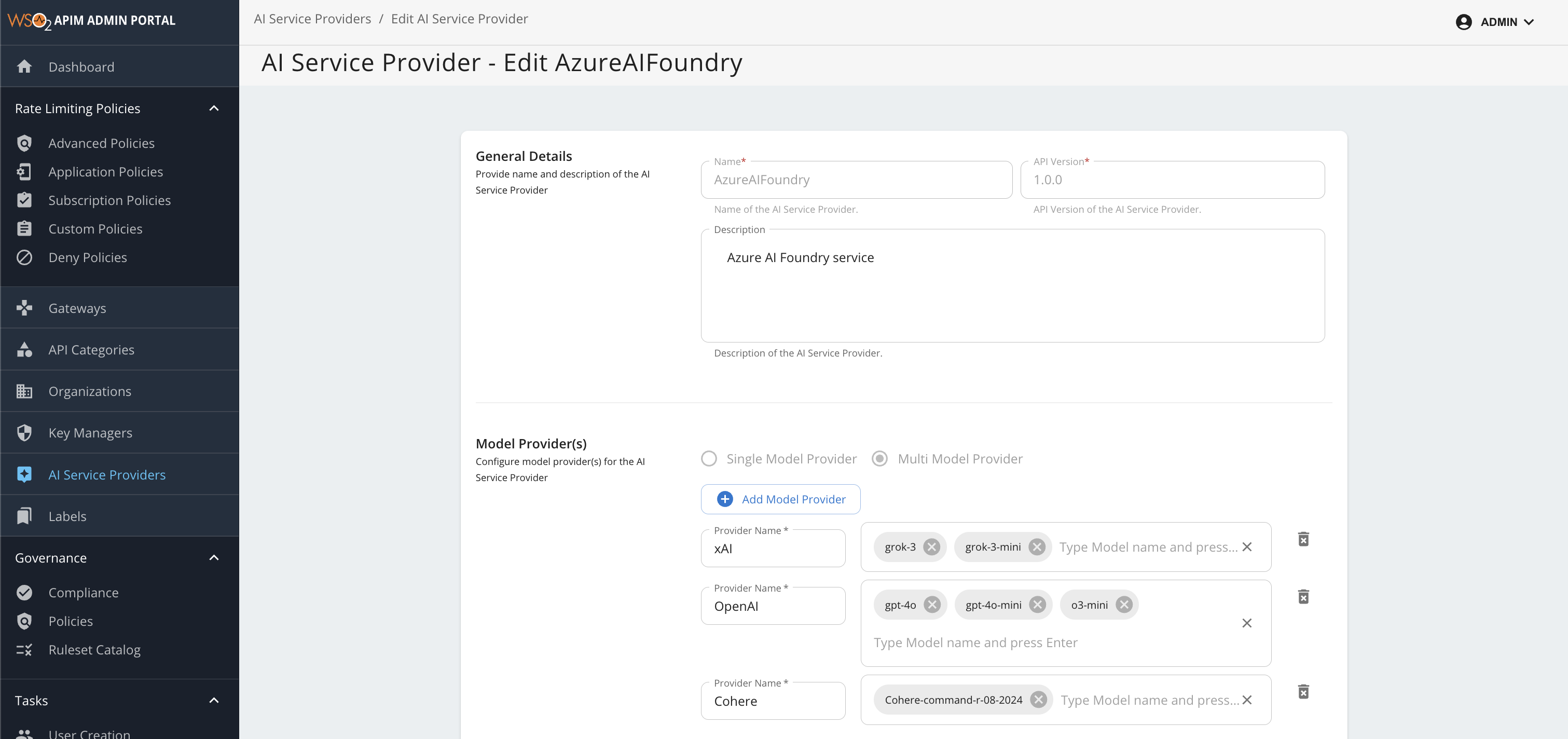 https://<hostname>:9443/admin) - Navigate to the AI Service Providers section in the left navigation pane