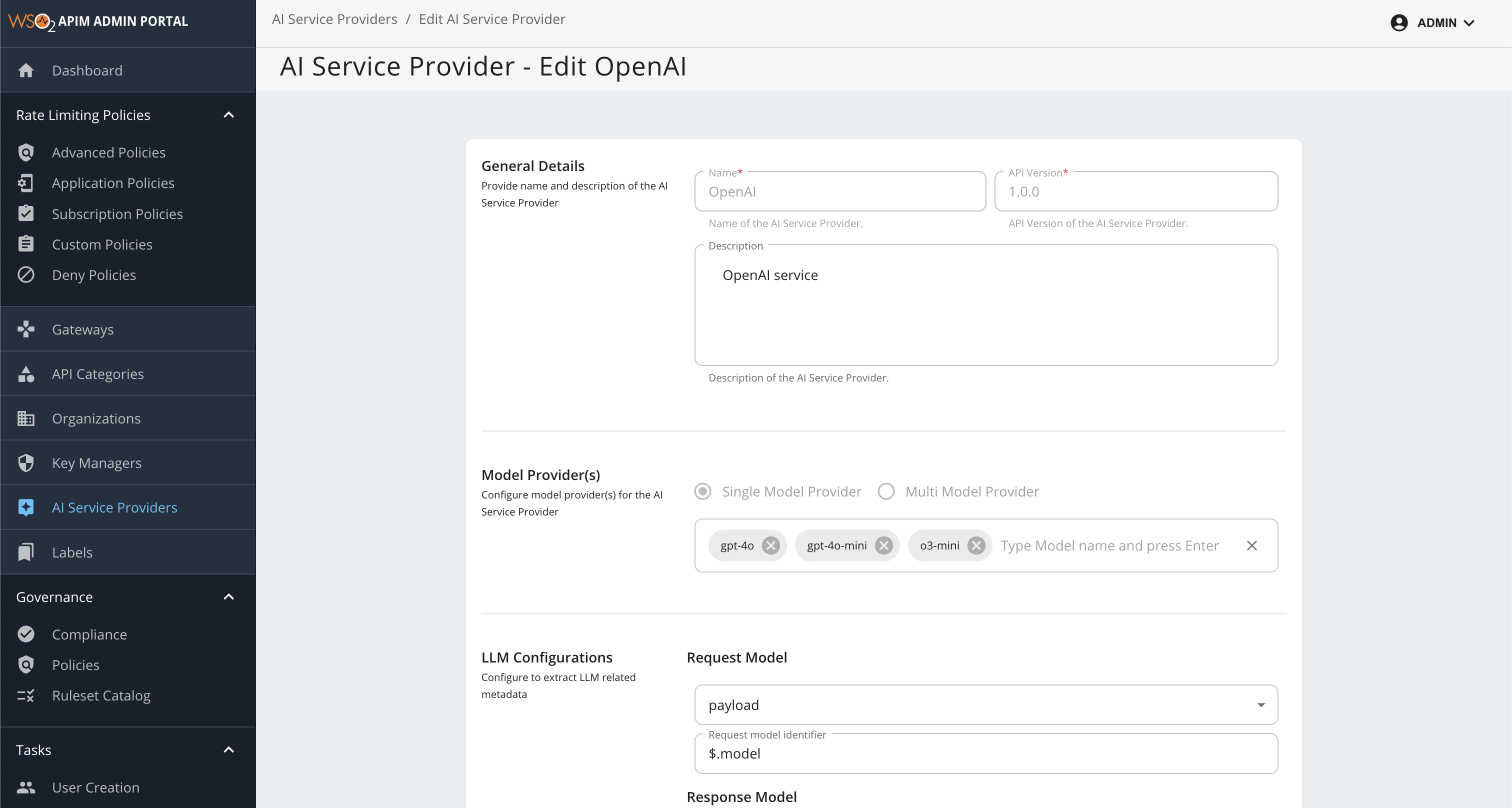 https://<hostname>:9443/admin) - Navigate to AI Service Providers → OpenAI