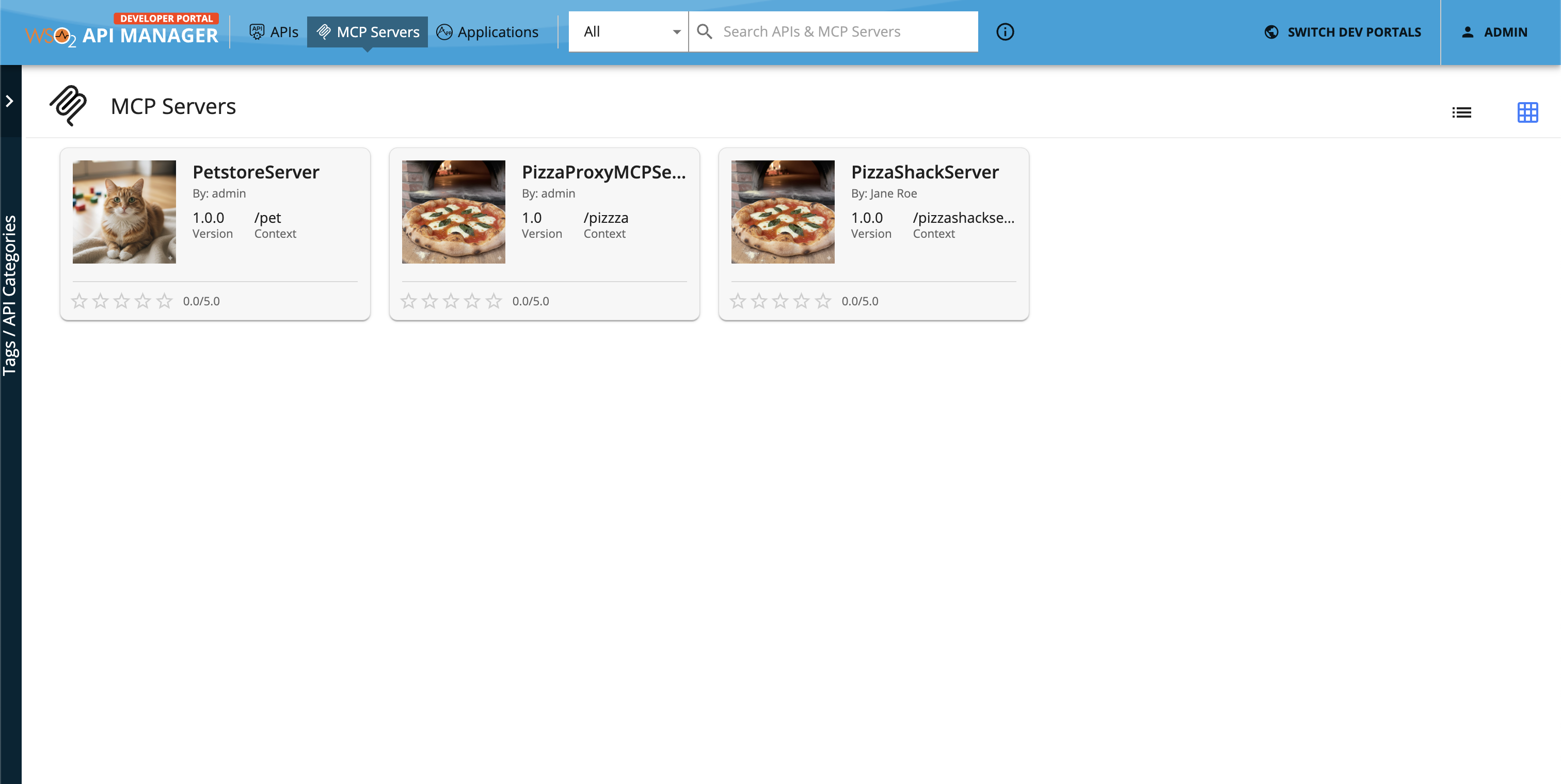 The examples here use the Petstore MCP Server, which is created and published to the Developer Portal in WSO2 API Manager.