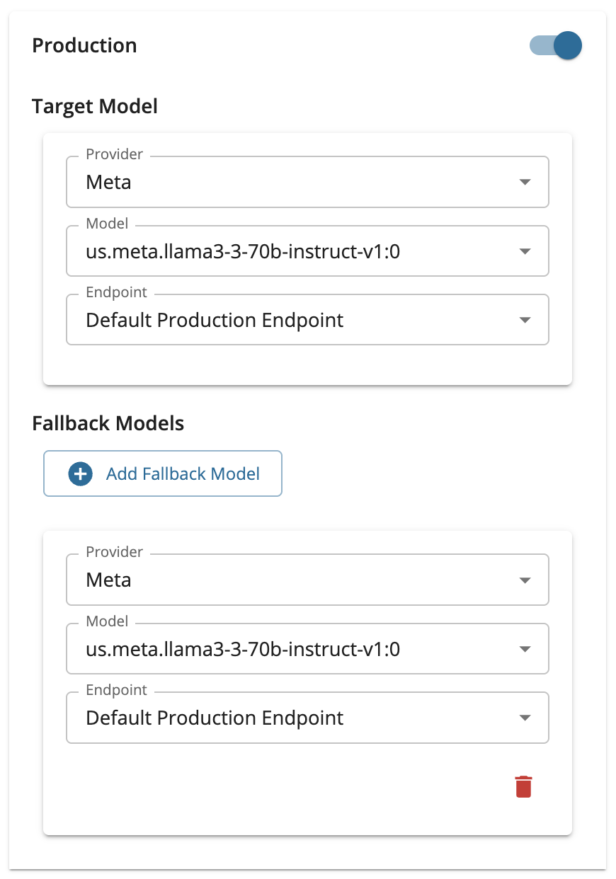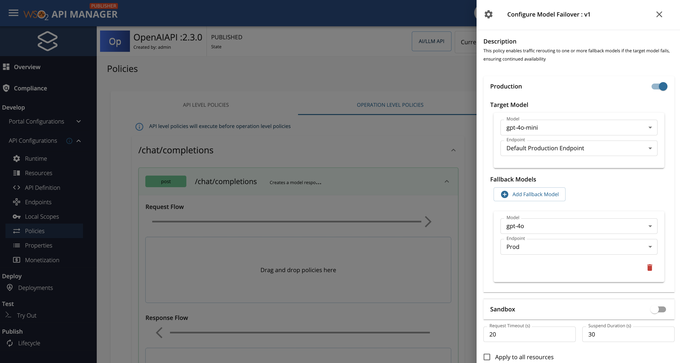 Section Description Production/Sandbox Select the target model and target endpoint. If the request made to this combination fails, fallback will get triggered. Add any amount of fallback models by clicking on Add Fallback Model button. For each fallback model addition, select a model and an endpoint from the respective dropdowns. Request Timeout Request timeout in seconds. Suspend Duration Suspend duration in seconds. This will be used to suspend any failed model-endpoint pairs. If not configured, knowledge about failed invocations are not persisted.
