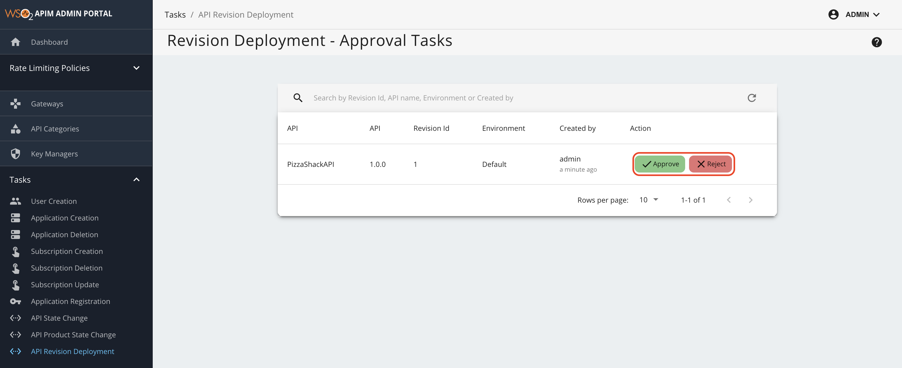 - Click on Approve or Reject to approve or reject the pending API revision deployment request(s).