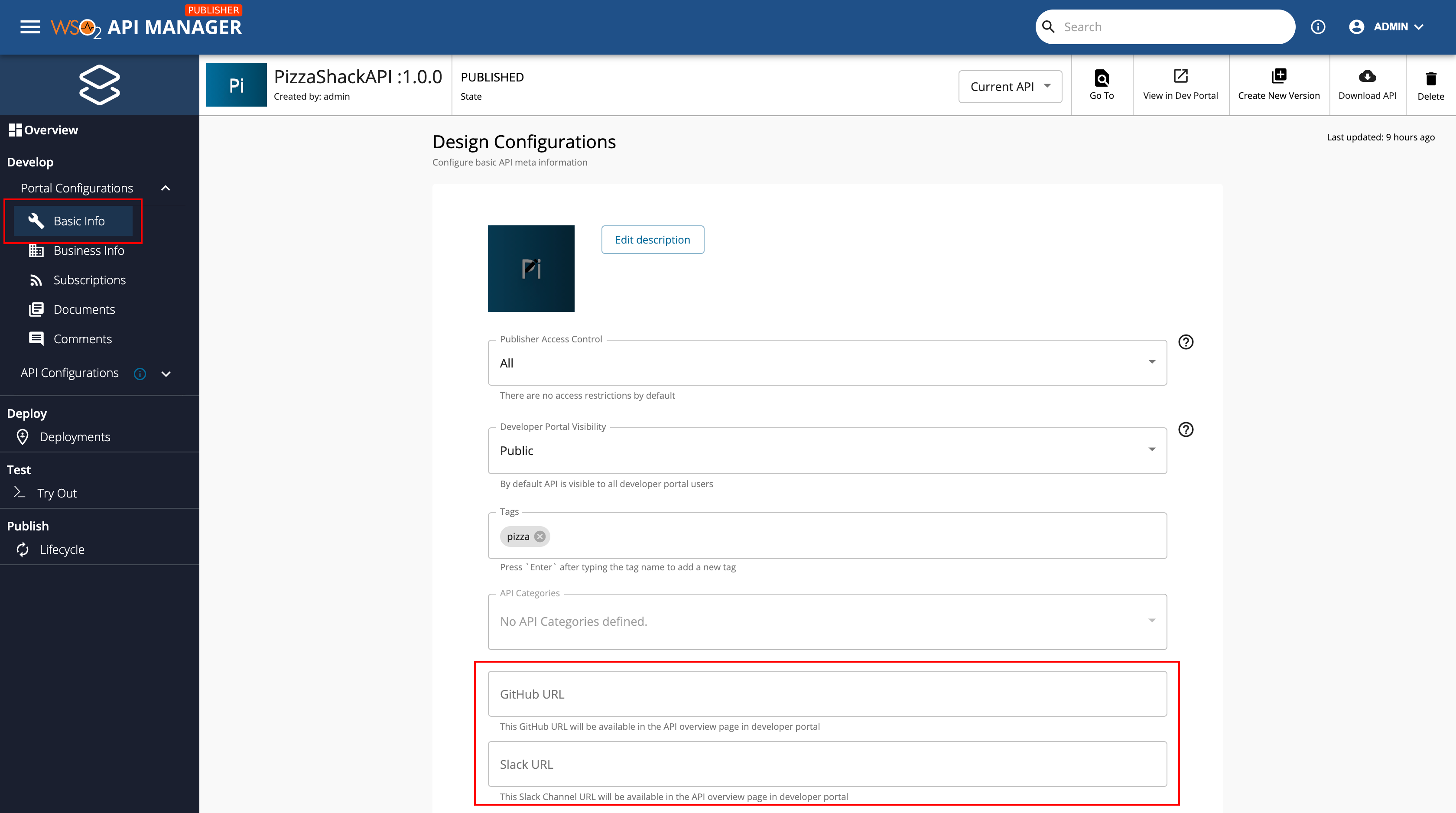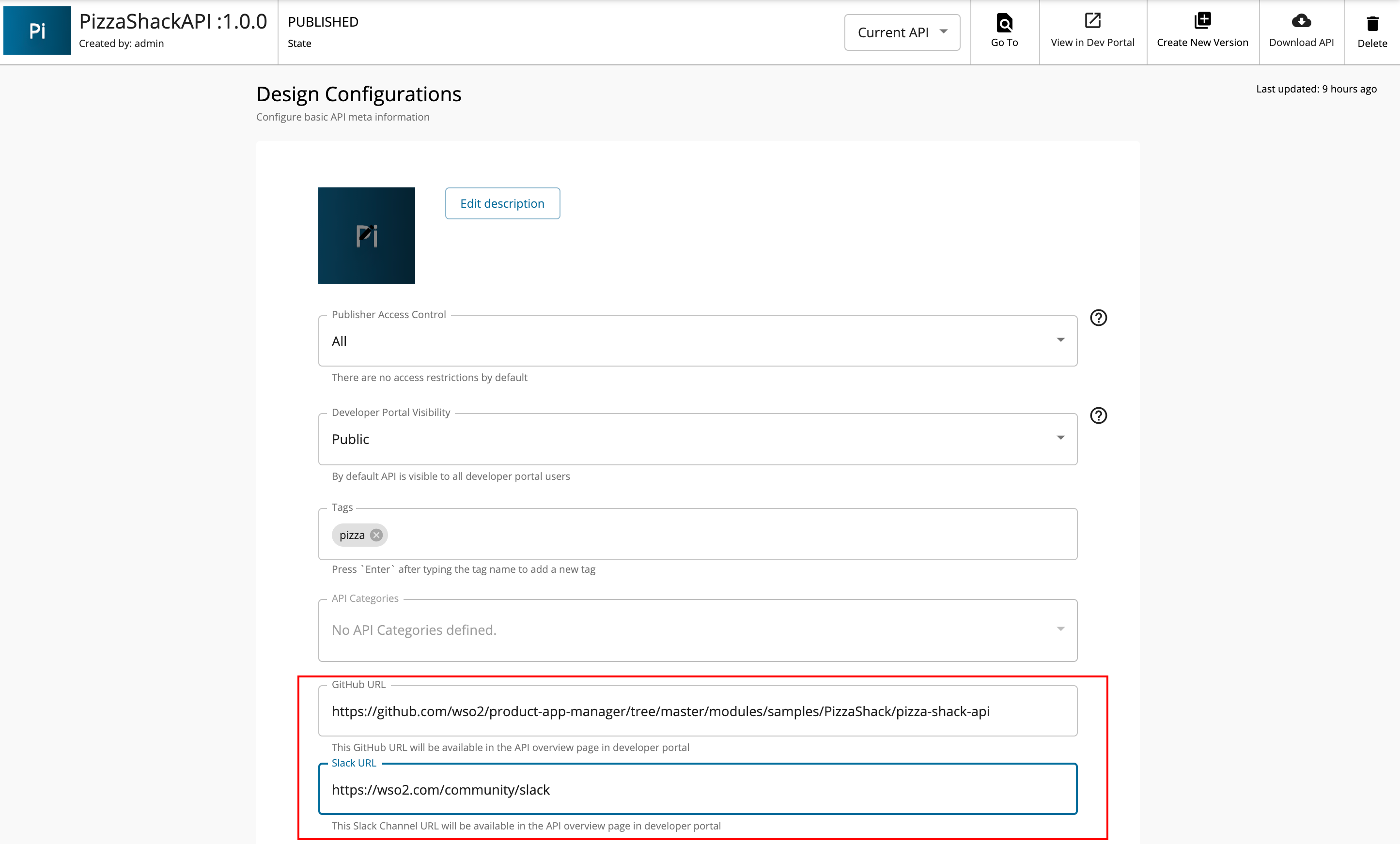 Follow the instructions below to enable the API related GitHub and Slack channel URLs to appear in the Developer Portal: