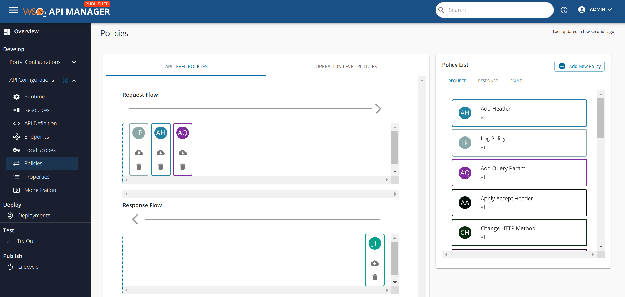 Once you drag and drop a default policy (Common policy that is accessible to all APIs) and save, to maintain the consistency of API object, the attached policy will be revisioned specific to the API. In case you delete the Common Policy from the publisher portal from the policies tab, this revision will be preserved as an API specific policy and once the policy is detached from the API, this revision will be cleared from the data storage. If you have created a different policy with the same name after deleting the original policy, you have to detach and reattach the policy to the resources if you need to apply the new policy.