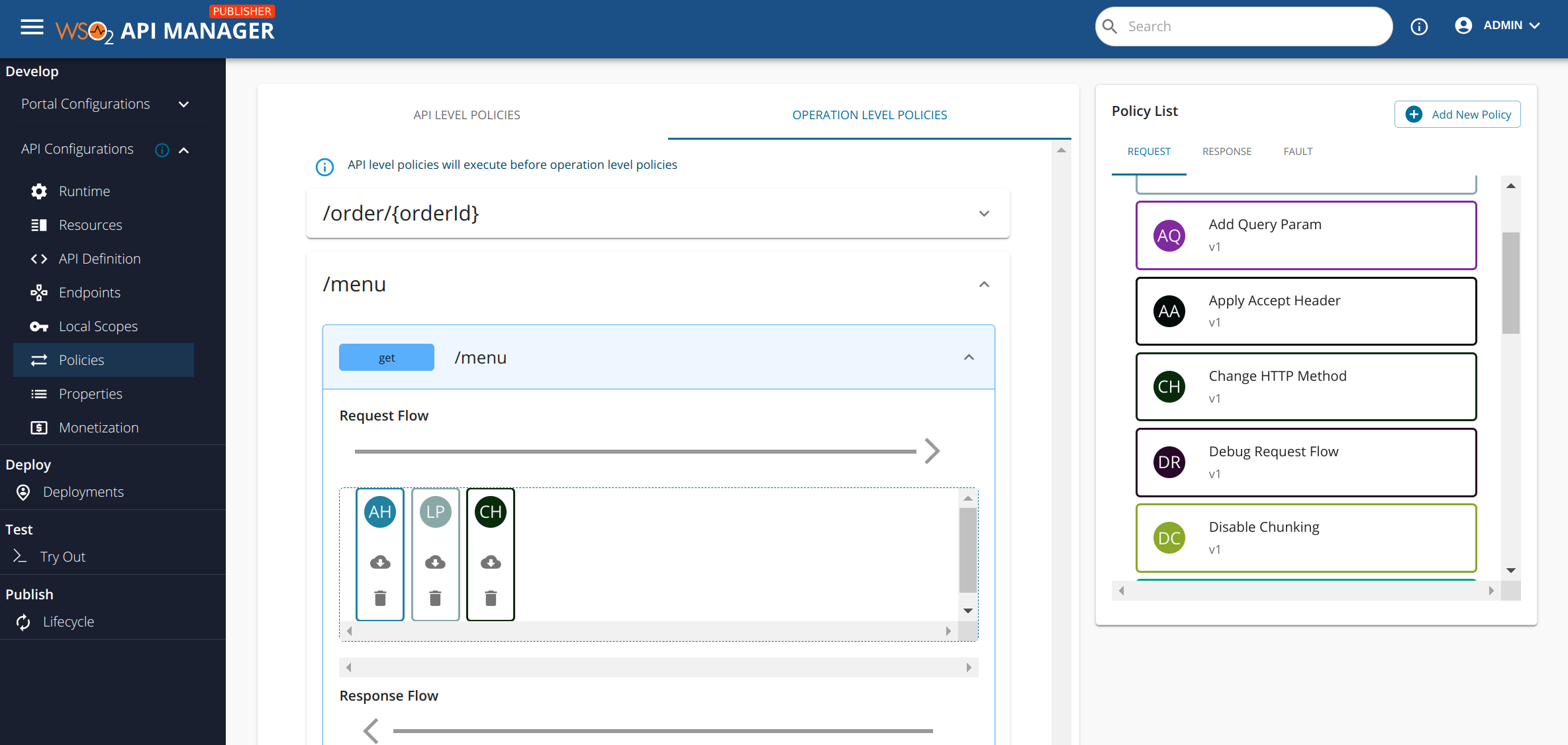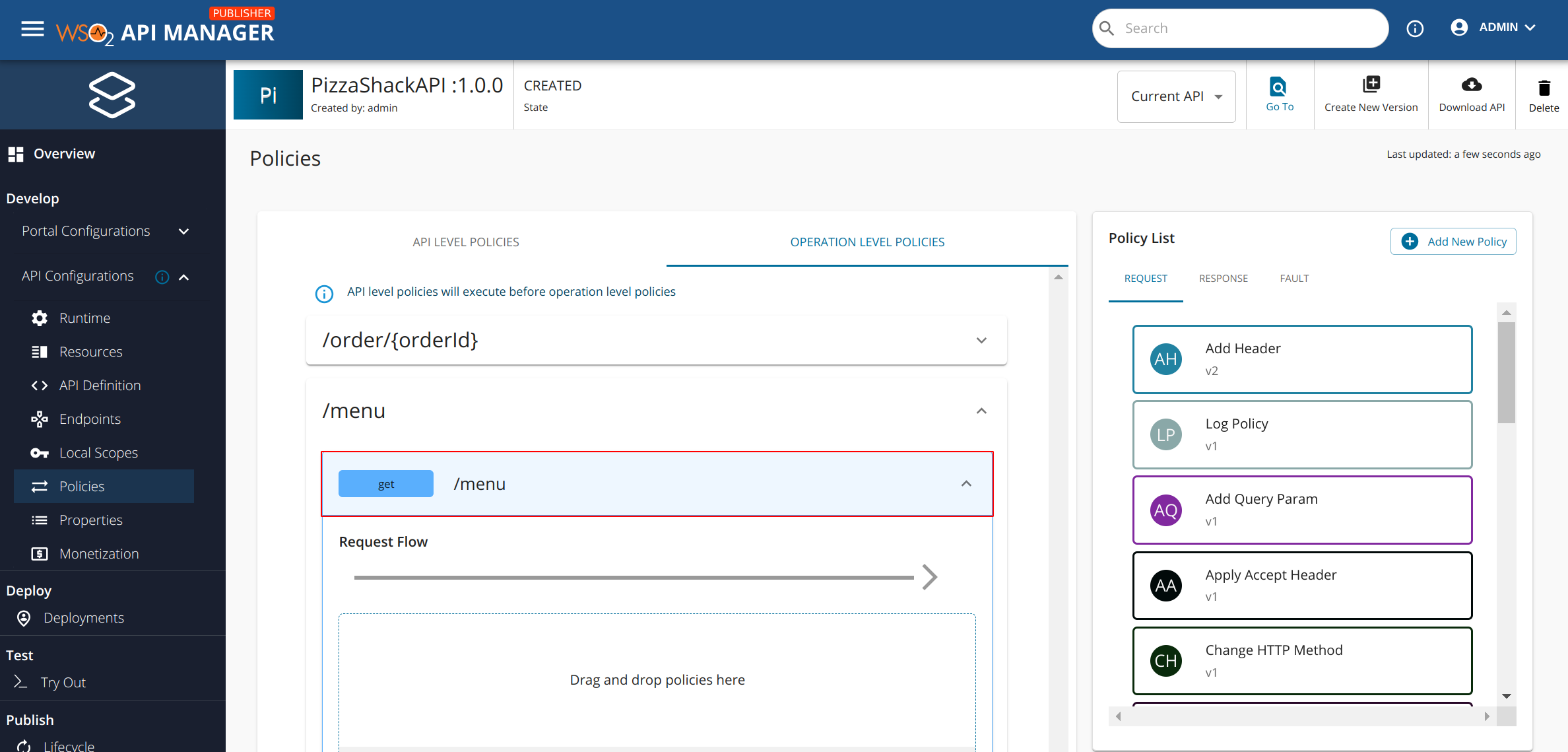 Now let us consider the Operation Level Policies tab. Pick out the desired operation and flow to which you want to attach policies. Once that is decided, you can expand that API operation. At this point you will notice that by default the UI will open up the first API operation on initial page visit (for PizzaShack API,
