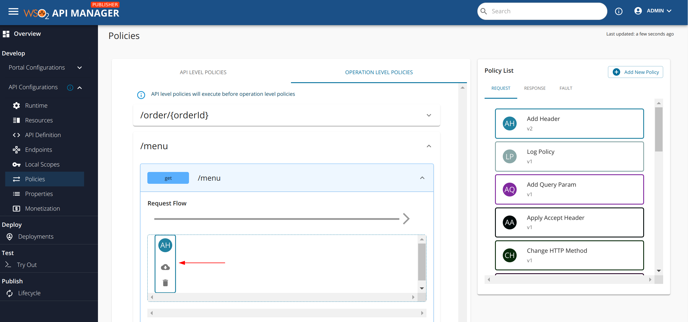 Now that we have saved the dropped policy, you should be able to see the attached Add Header policy (depicted with the initials