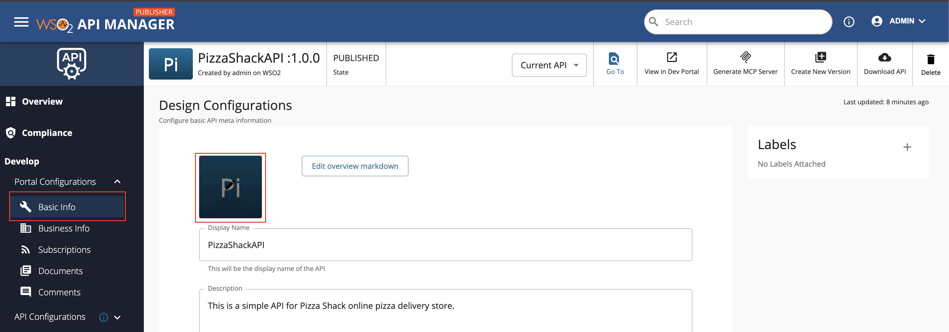 The thumbnail of an API can be changed by uploading an image for the thumbnail or by designing a new thumbnail image via the Publisher.