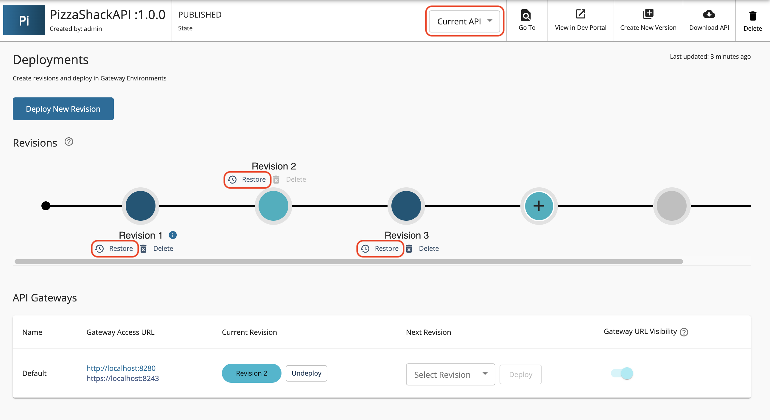 Publishedwill only display the API in the Developer Portal and will not handle the deployment anymore. - Deploying an API in a Gateway requires an additional step. The publisher has to create a revision and deploy that revision in the required Gateway environment(s).