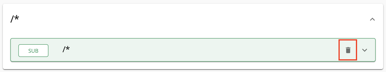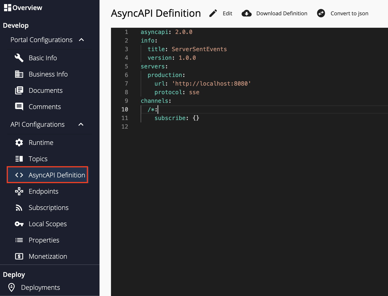 Topics of an SSE API are always Subscribe only, where the flow of events will be from the server (backend) to the client. By default, an SSE API will have a topic with the name /*.