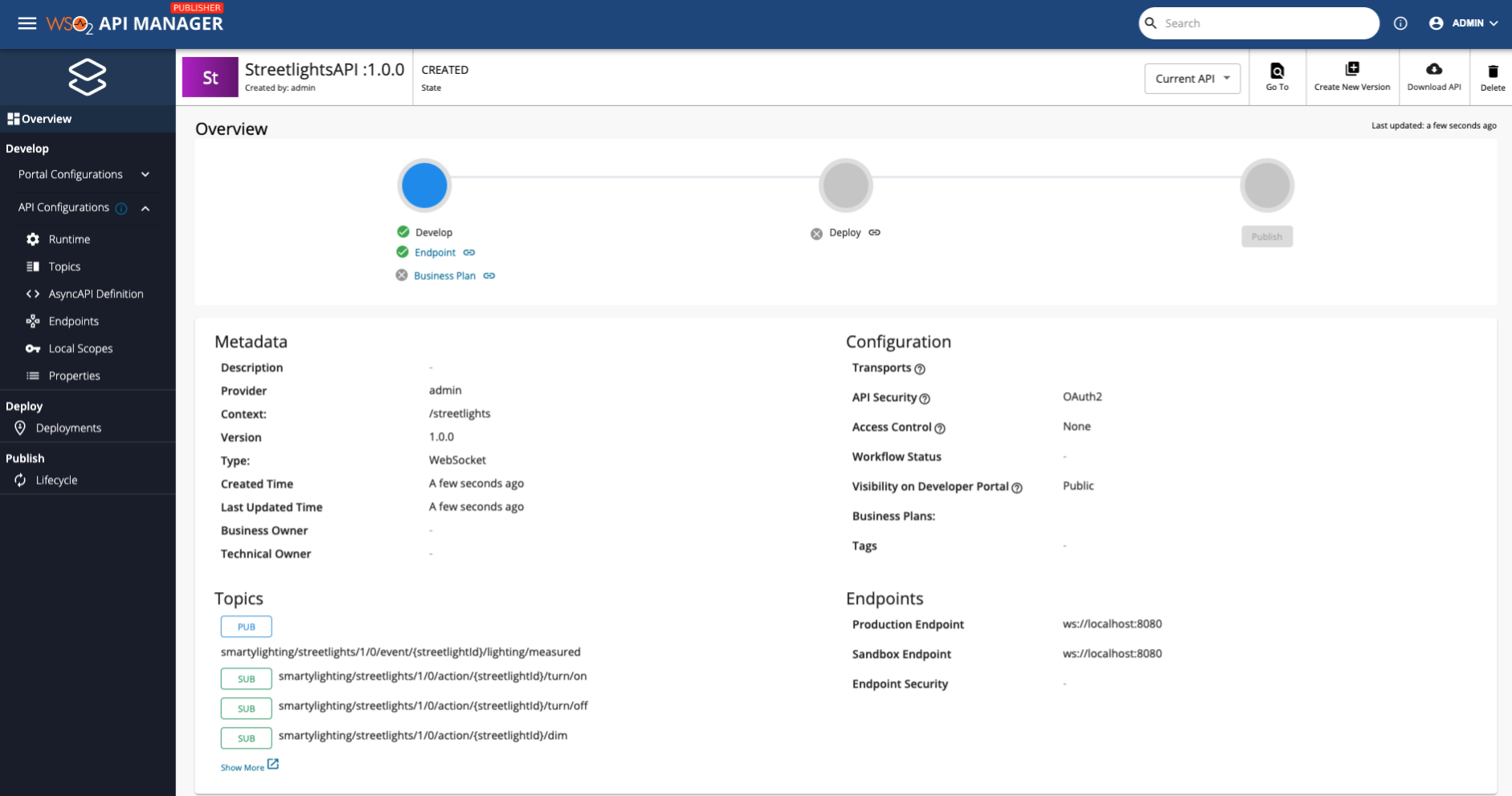 Field Sample value Name StreetlightsAPI Context /streetlights Version 1.0.0 Protocol WebSocket (or any other type of Streaming API) Endpoint ws://localhost:8080 Now, the StreetlightsAPI API overview page will appear.