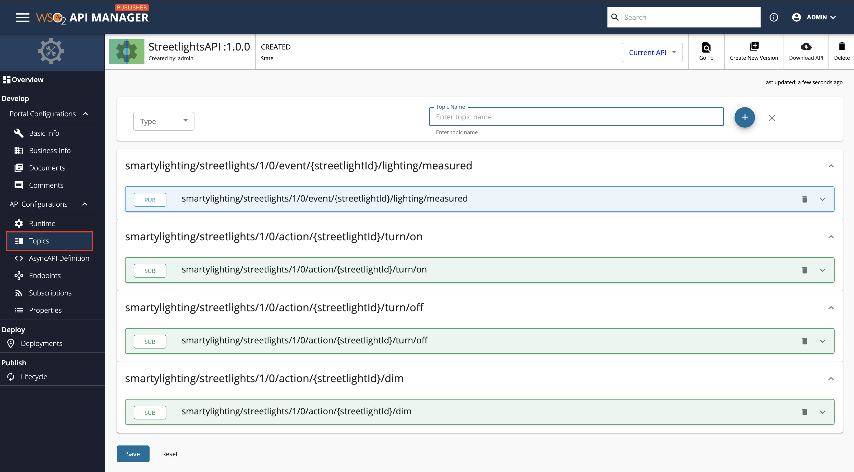You will notice that the topics have been created automatically from the AsyncAPI definition specified in the provided URL.