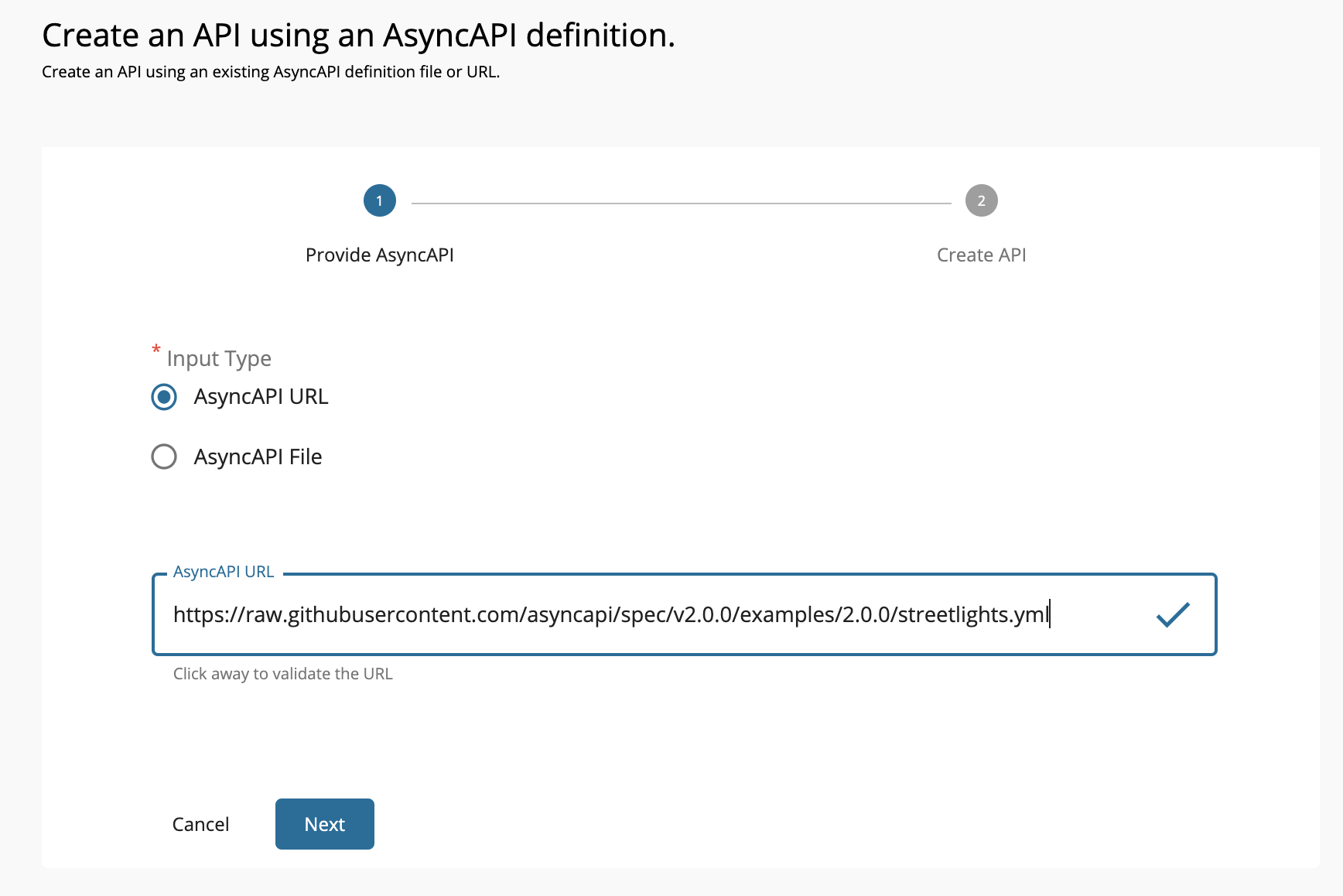 For this example, let's select AsyncAPI URL, provide the following URL, and click Next.