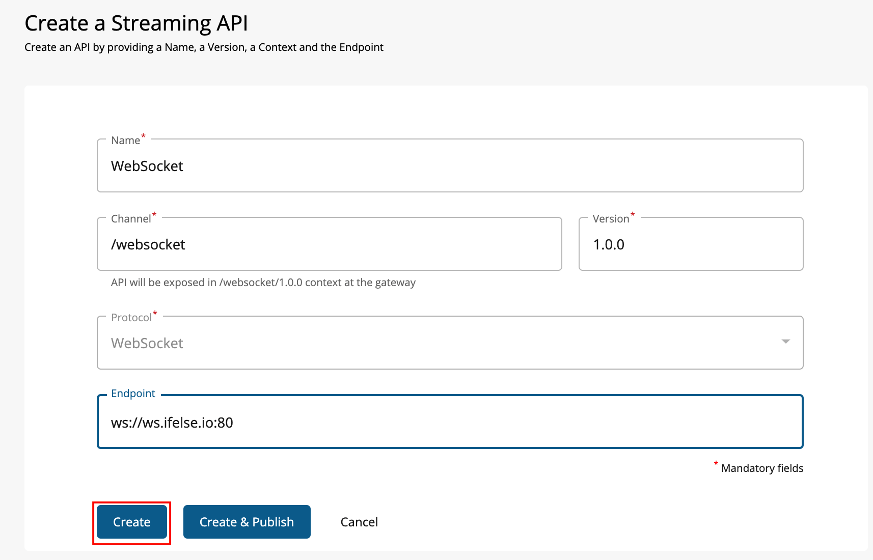 Field Sample value Name WebSocket Context /websocketThe API context is used by the Gateway to identify the API. Therefore, the API context must be unique. This context is the API's root context when invoking the API through the Gateway.