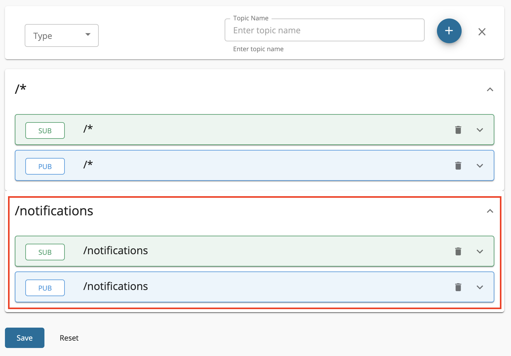 Select the Types, enter the Topic Name, and click + as shown below, to add a new topic.