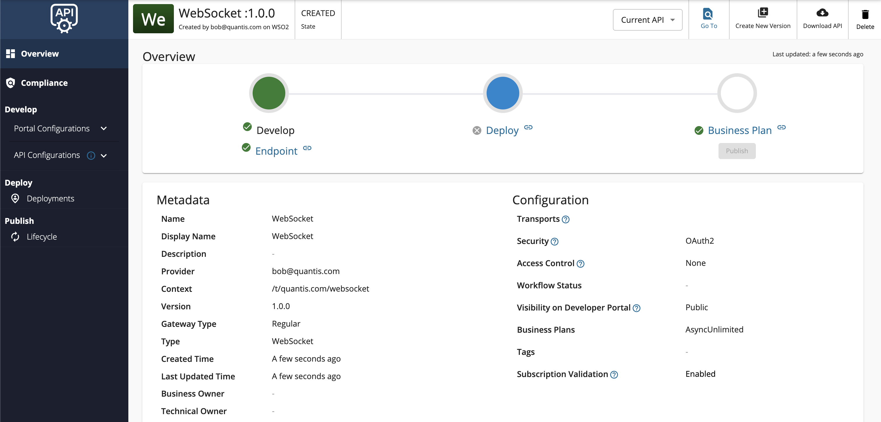 Once you create and publish a WebSocket API, you can also deploy the API you created.