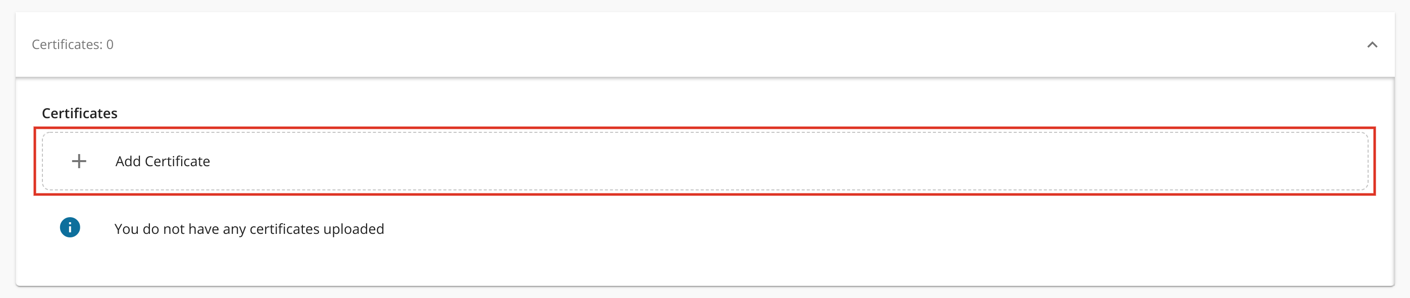 Name Description Alias Enter a name for your certificate. Endpoint Select an endpoint from the dropdown list. Certificate Drag and drop the certificate file or click on the drop zone to select the certificate via the UI The uploaded certificate will be displayed.