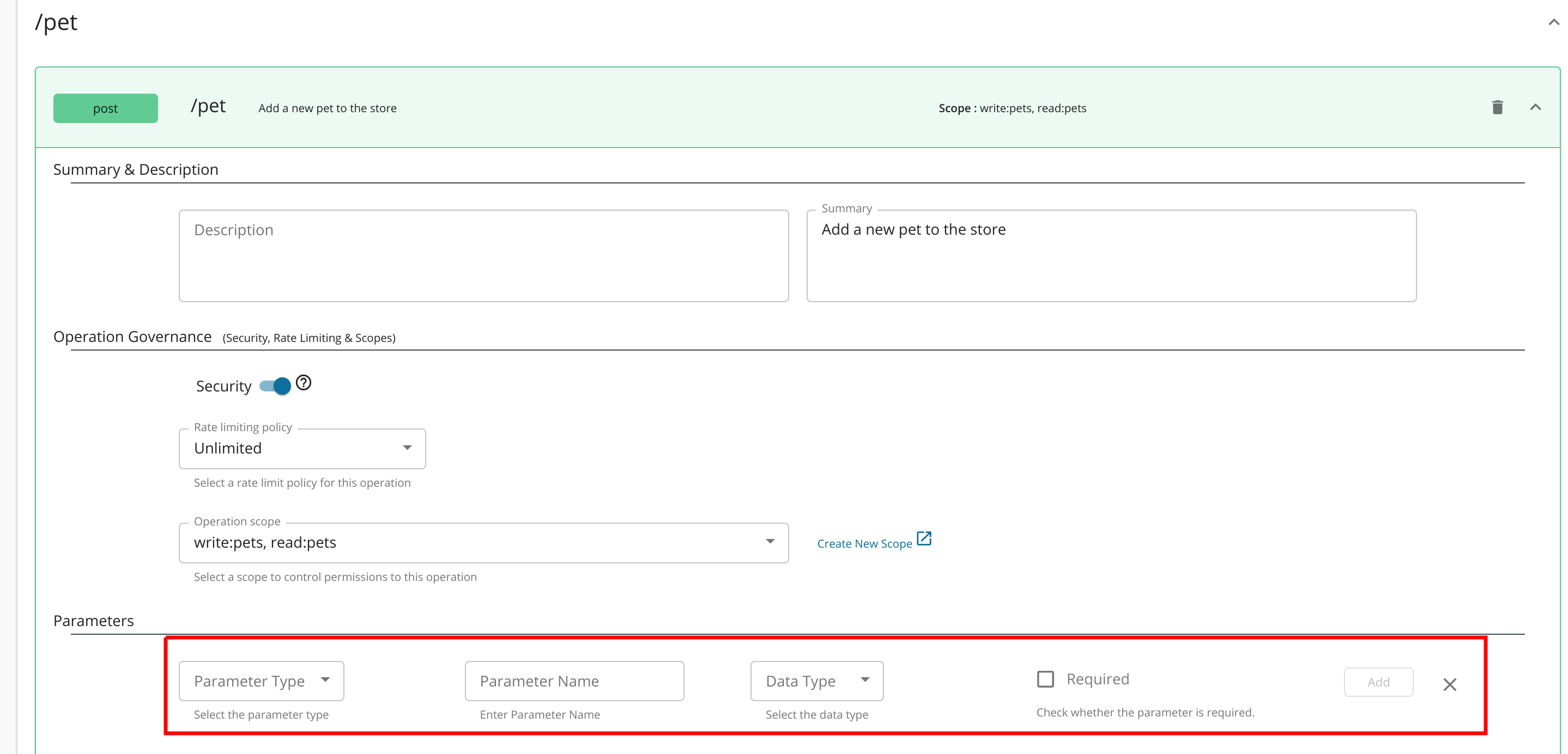 POSTmethod) to expand it. Note the parameters section highlighted below.