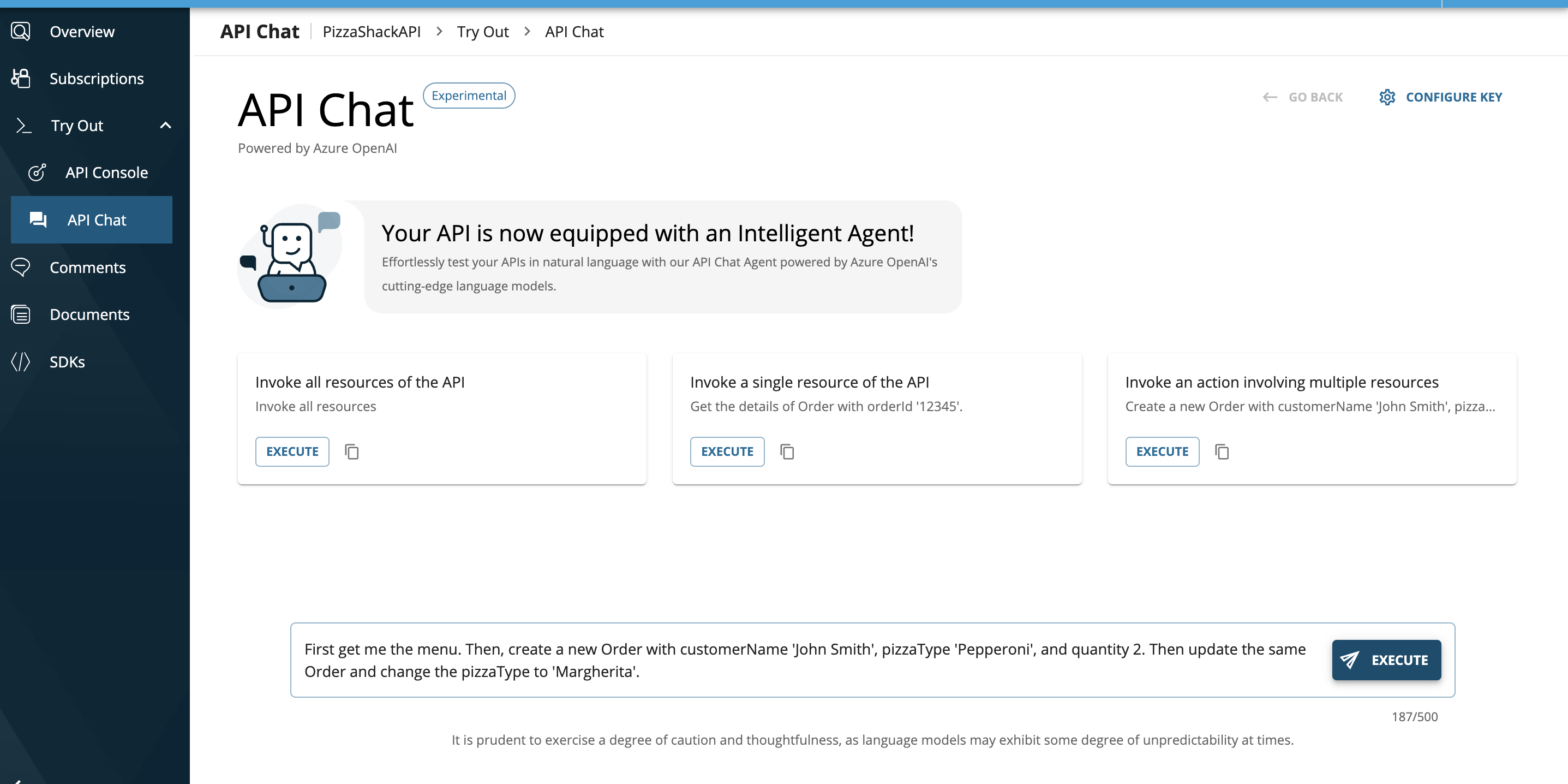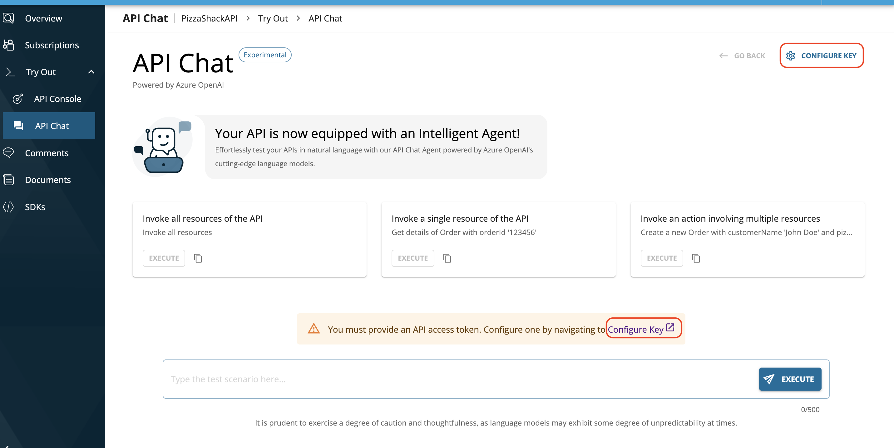 Now visit the API Chat tab under the Try Out section. Since the API Chat will test your API based on your natural language query, it needs access to the API. As per the warning shown below, we need to provide an API access token. Either click on the link given in the banner or click CONFIGURE KEY to generate one.
