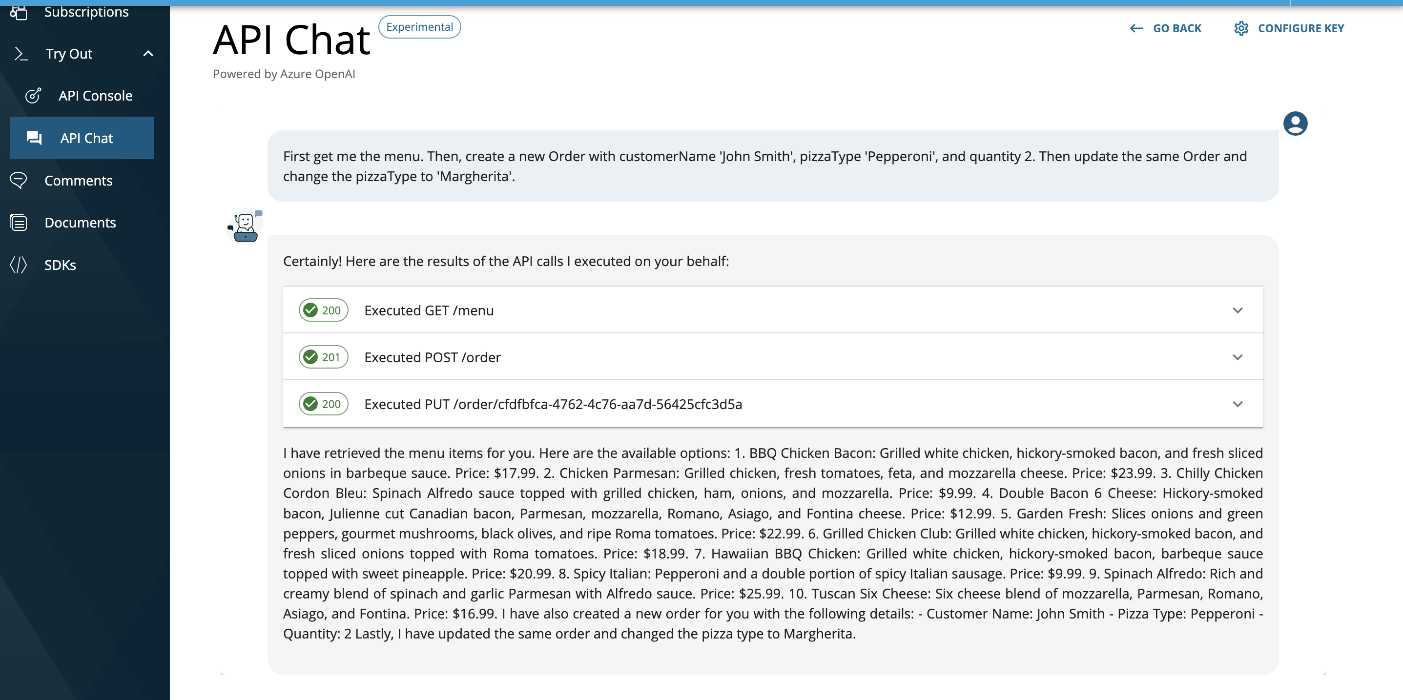 Let's provide our own query for this guide: First get me the menu. Then, create a new Order with customerName 'John Smith', pizzaType 'Pepperoni', and quantity 2. Then update the same Order and change the pizzaType to 'Margherita'.