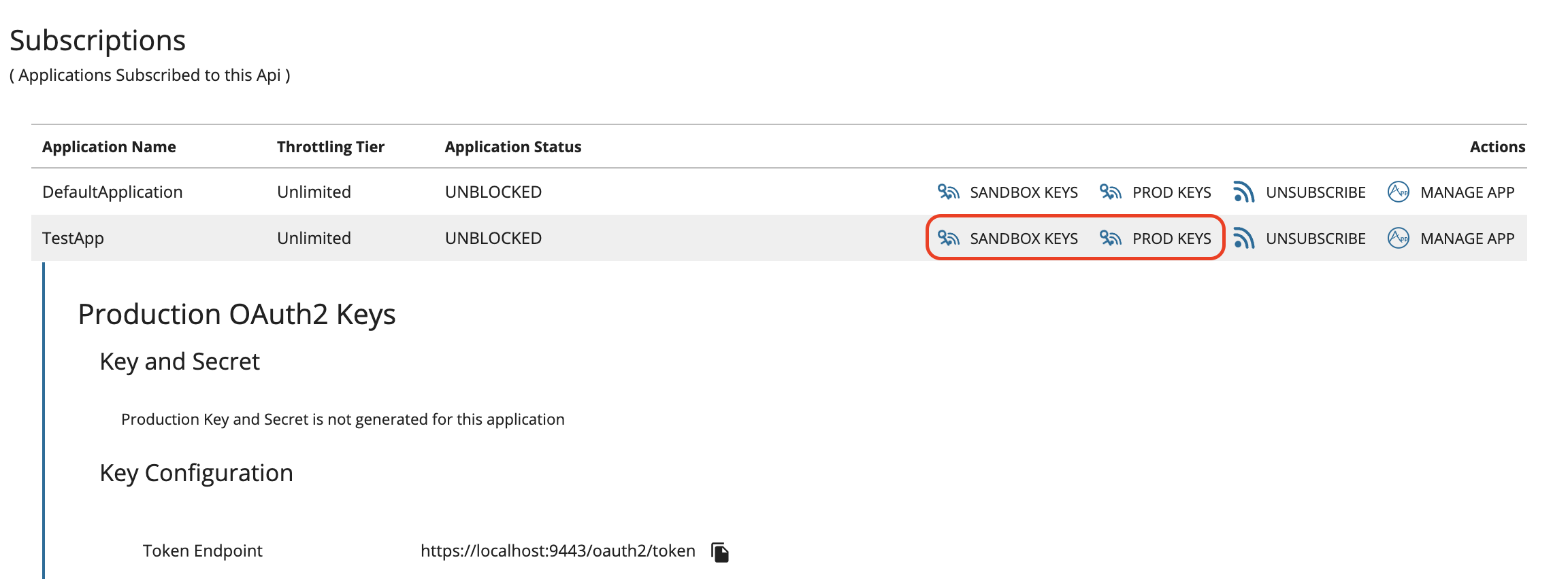 Next, generate either a production key or a sandbox key using one of the following actions. You have to scroll down and click Generate Keys.