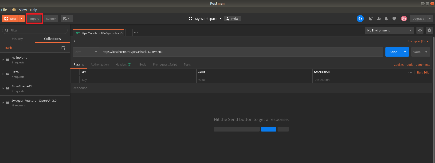 Open the Postman application and click Import to import the Postman collection file that you downloaded.