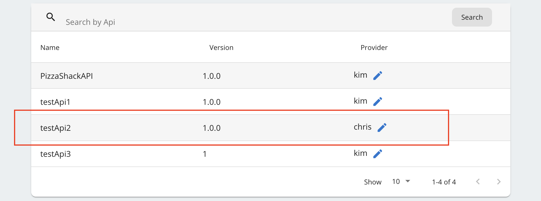 For example, let's consider that Chris and Kim are in the same organization and that Kim owns testApi and he wants to transfer the ownership of testApi to Chris.