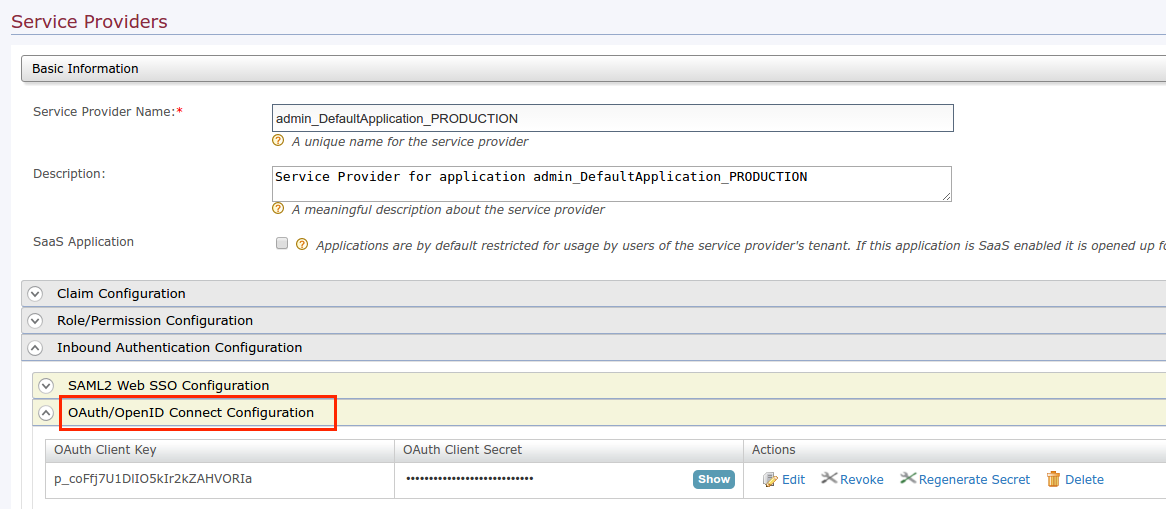 Expand the Inbound Authentication Configurations section and select **OAuth/OpenID Configuration