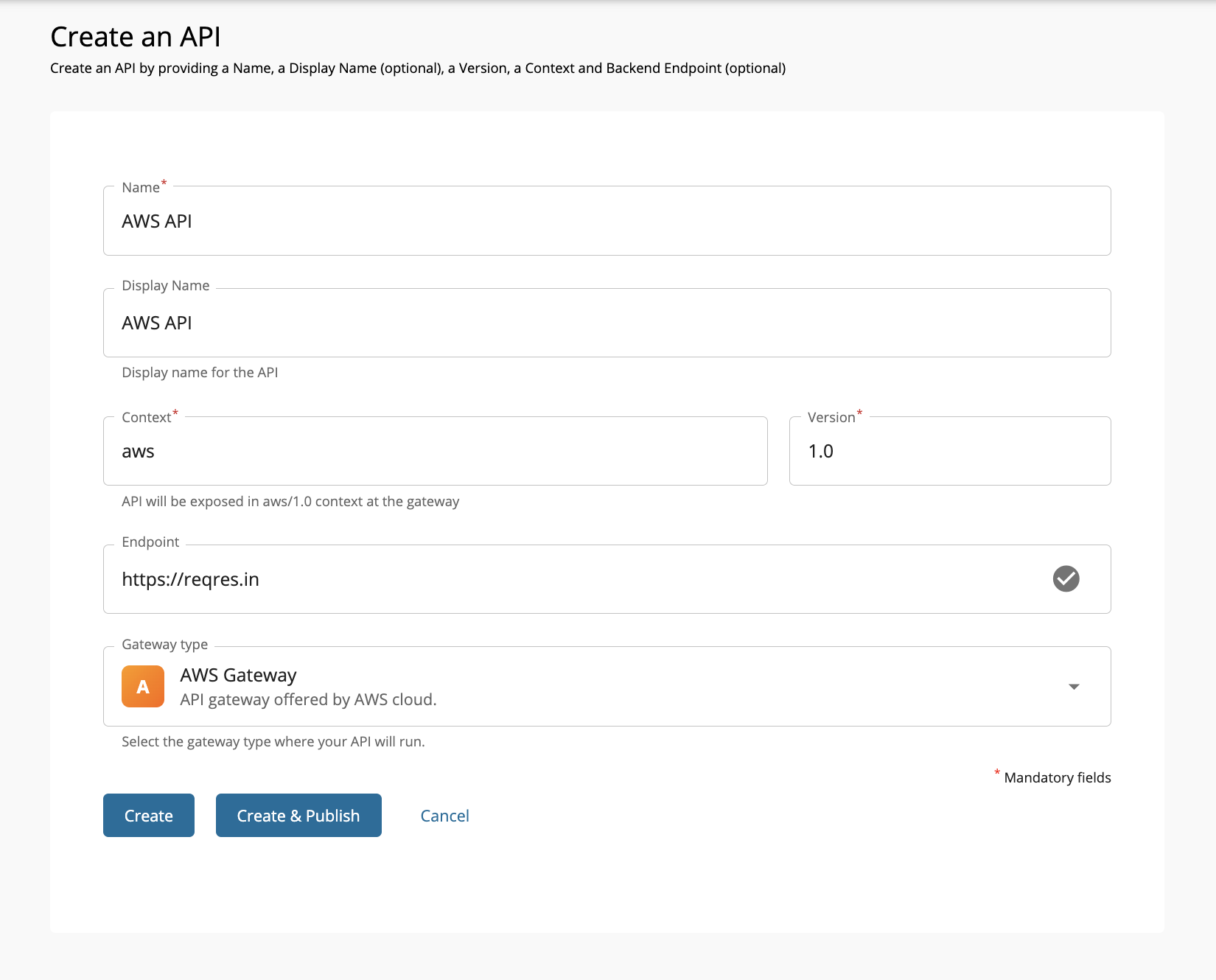 Create a new REST API and select Gateway Type as AWS. And provide a valid endpoint URL.