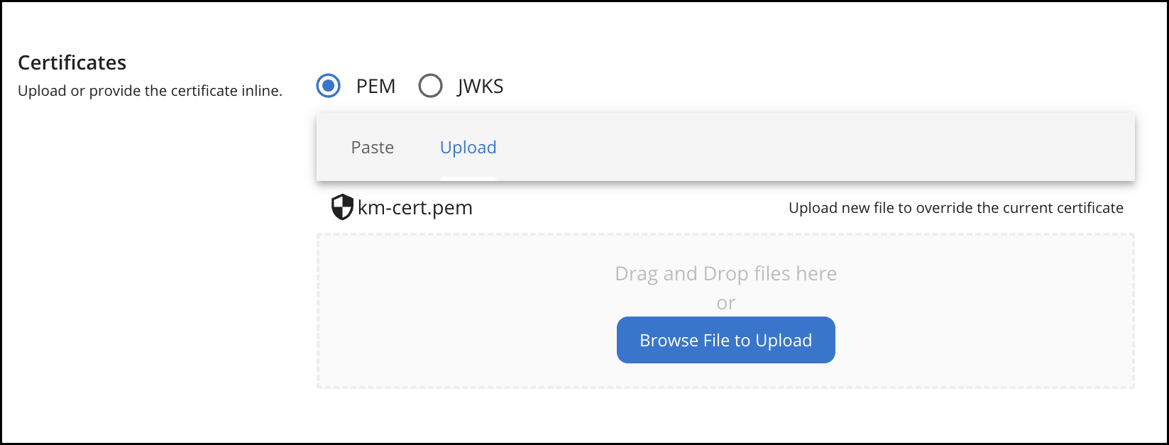Kong Gateway on Kubernetes requires PEM-format certificates. Therefore, you need to upload the PEM Certificate to the Resident Key Manager (or any other Key Manager you are using).