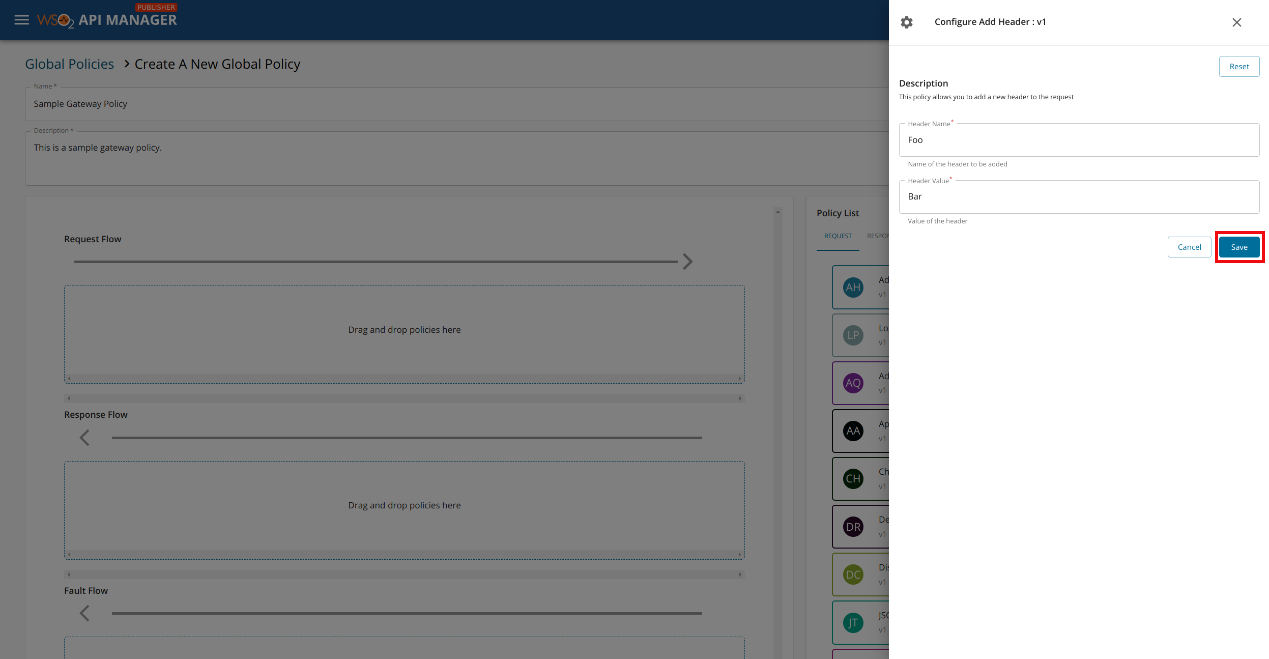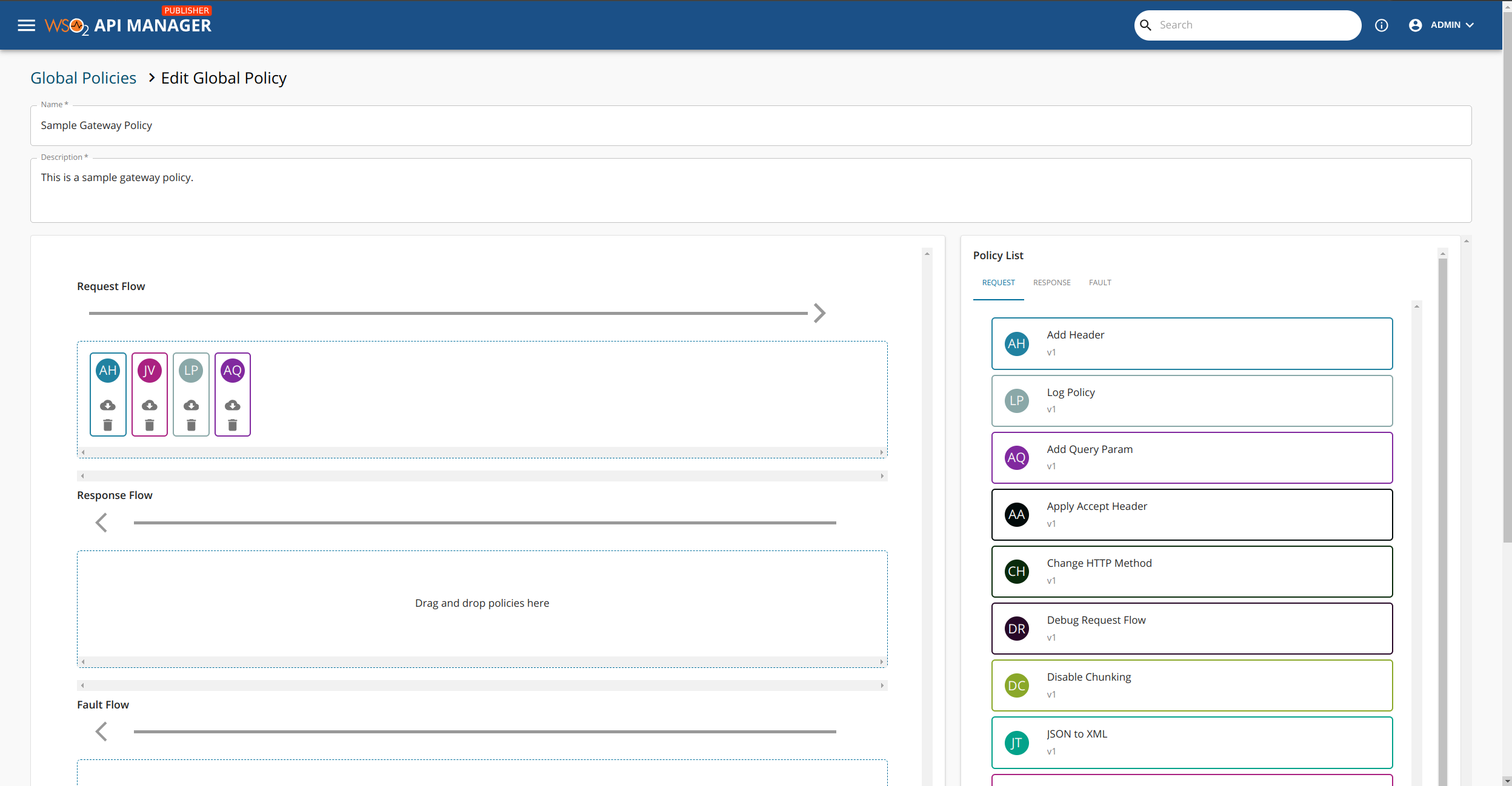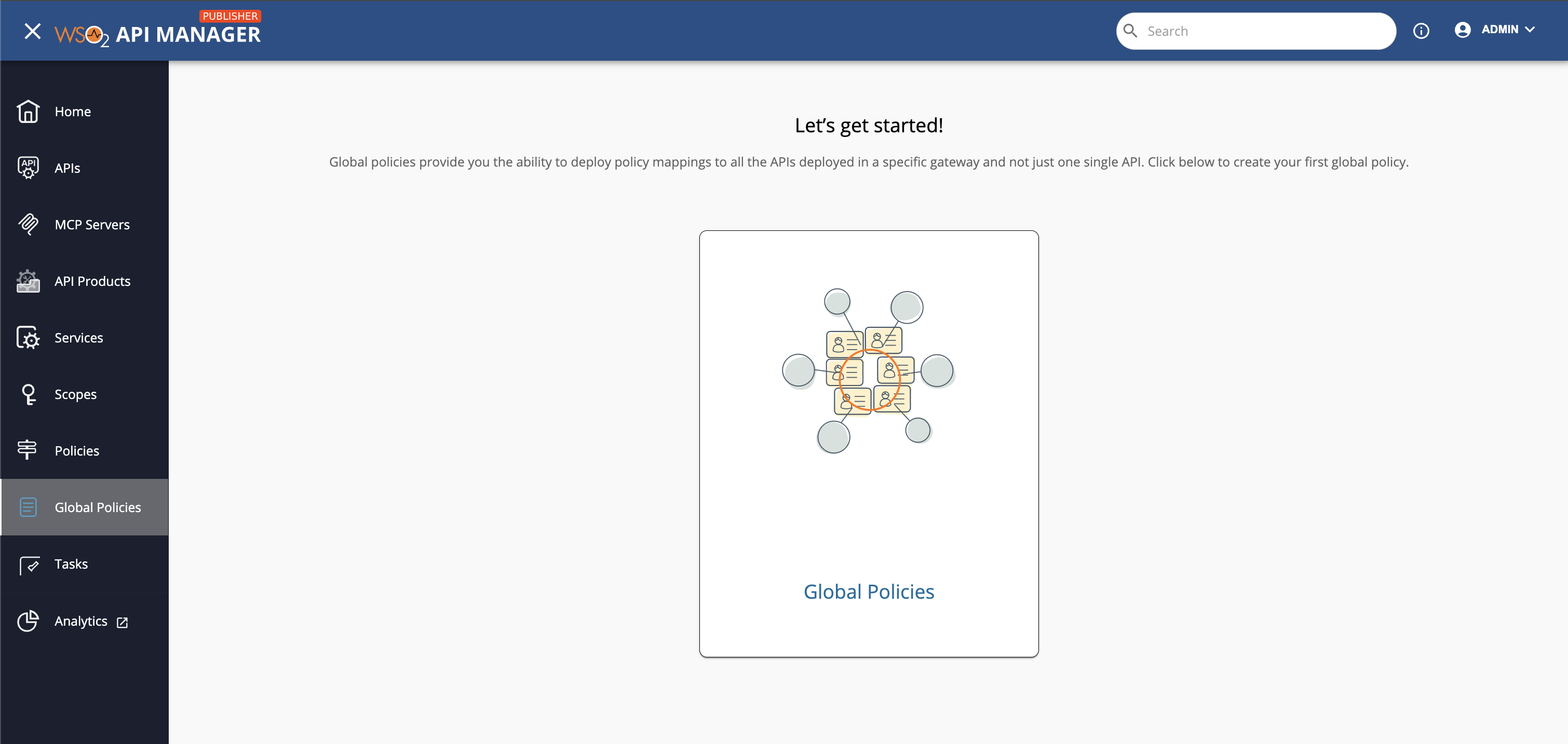 Although all managing actions can be performed by admin users with specific scopes, API creators and publishers can view the meta information of global policies such as names, descriptions, policy mappings, and deployed gateway labels.