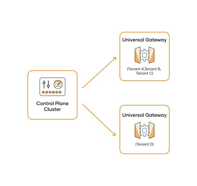 In this deployment pattern, each tenant gets its own dedicated Universal Gateway instance. This provides the highest level of isolation but requires more infrastructure resources.