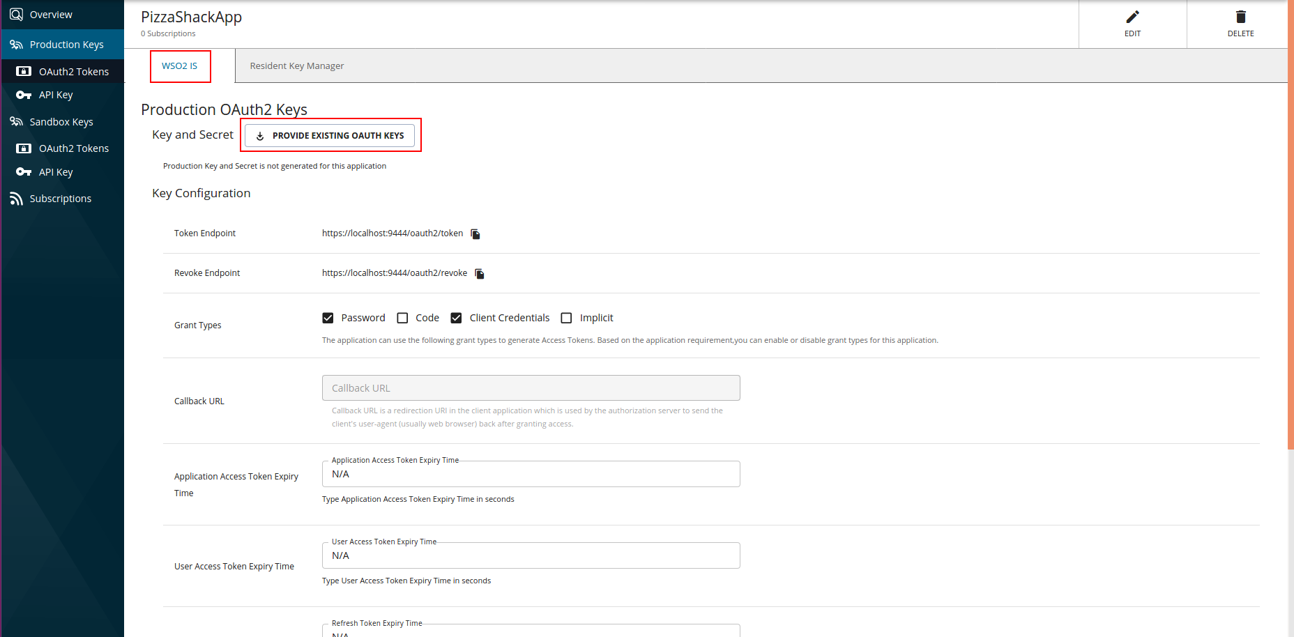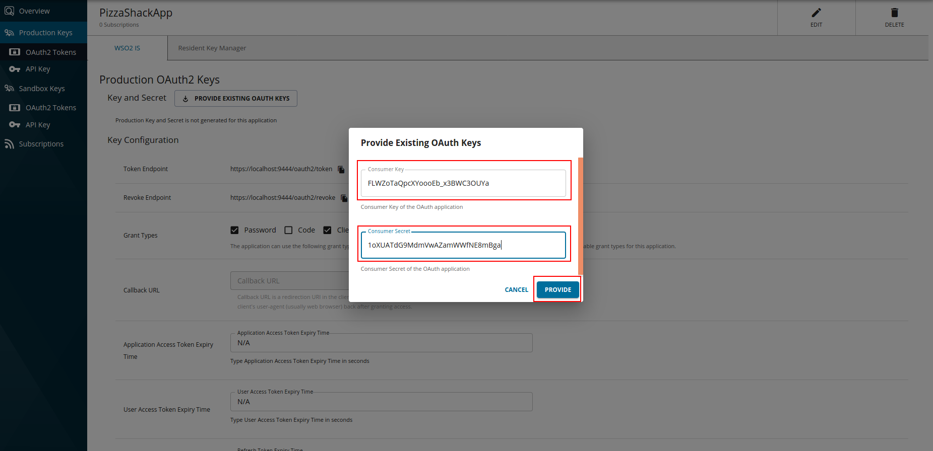IS).The PROVIDE EXISTING OAUTH KEYS button appears under the Production OAuth2 Keys section.