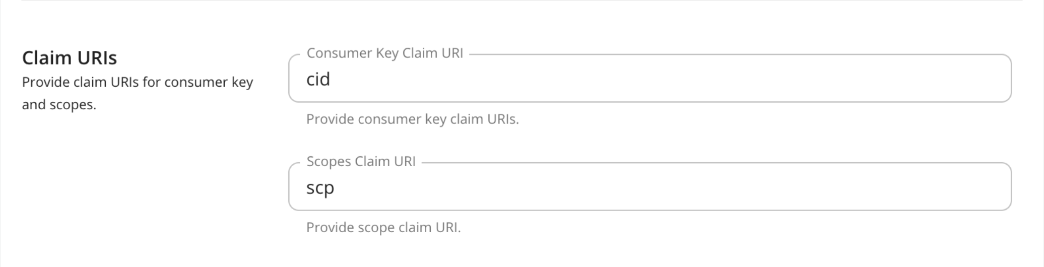 Configuration Description Consumer Key Claim URI The claim URI for consumer key e.g., cid Mandatory Scopes Claim URI The claim URI for scopes e.g., scp Mandatory