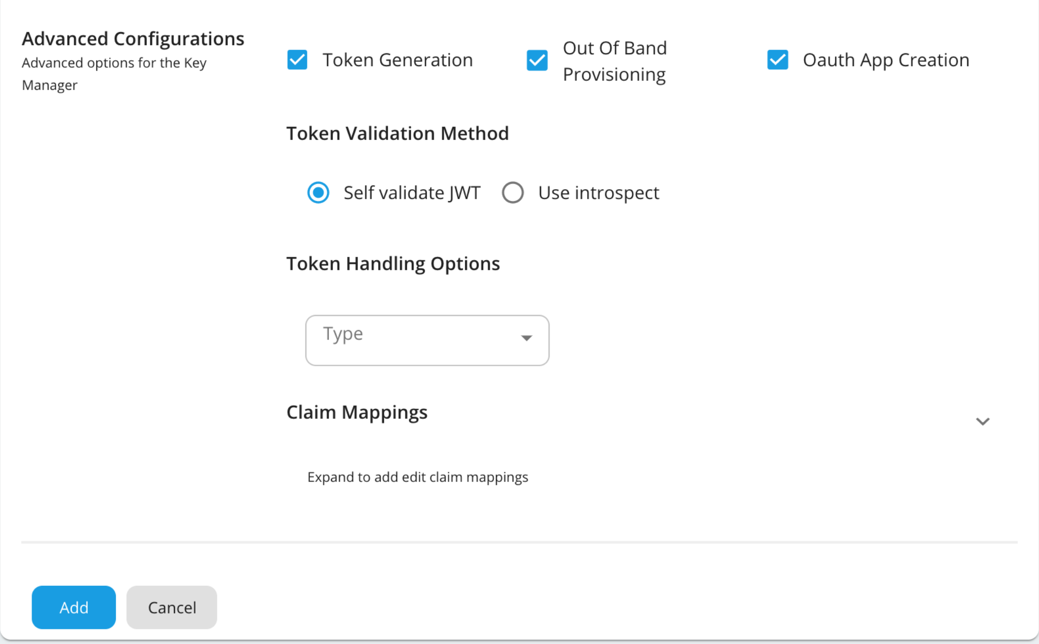 Configuration Description Token Generation This enables the token generation process via the Authorization Server. Optional Out Of Band Provisioning This enables the provisioning of Auth clients that have been created without the use of the Developer Portal, such as previously created Auth clients. Optional OAuth App Creation This enables the creation of Auth clients. Optional Token Validation Method The method used to validate the JWT signature. This is mandatory if the Token Validation Method is introspect Self Validate JWT The kidvalue is used to validate the JWT token signature. If the `kidvalue is not present, thegateway_certificate_aliasis used.Optional Use introspect The JWKS endpoint is used to validate the JWT token signature. If this option is used to validate the tokens it is mandatory to add a Token Handling Option For Okta it should be JWT and it is required to specify a claim mapping as a unique identifier. e.g., Claim Key : iss Claim Value : https://dev-599740.okta.com/oauth2/default Optional Token Handling Options This provides a way to validate the token for this particular Authorization Server. Optional This is mandatory if the token validation method is introspect REFERENCE The tokens that match a specific regular expression (regEx) are validated. JWT The tokens that match a specific JWT are validated. CUSTOM The tokens that match a custom pattern are validated. Claim Mappings Local and remote claim mapping. Optional