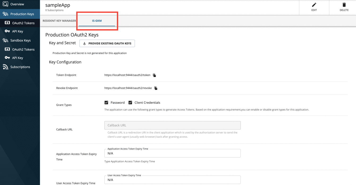 The keys generated for an application using the Global Key Manager will be displayed across tenants. In this example scenario, the keys for the sampleApp were generated in the Super Tenant’s Developer Portal. These keys are reflected in the Production Keys of the IS-GKM tab of the sampleApp in the abc.com’s Developer Portal