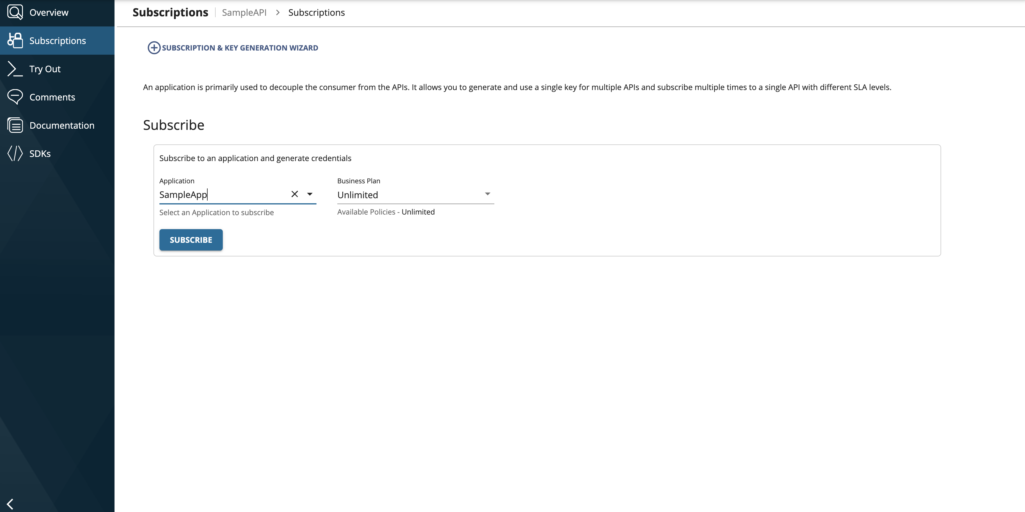 Go to the Developer Portal landing page, select the SampleAPI and Subscribe to the SampleApp
