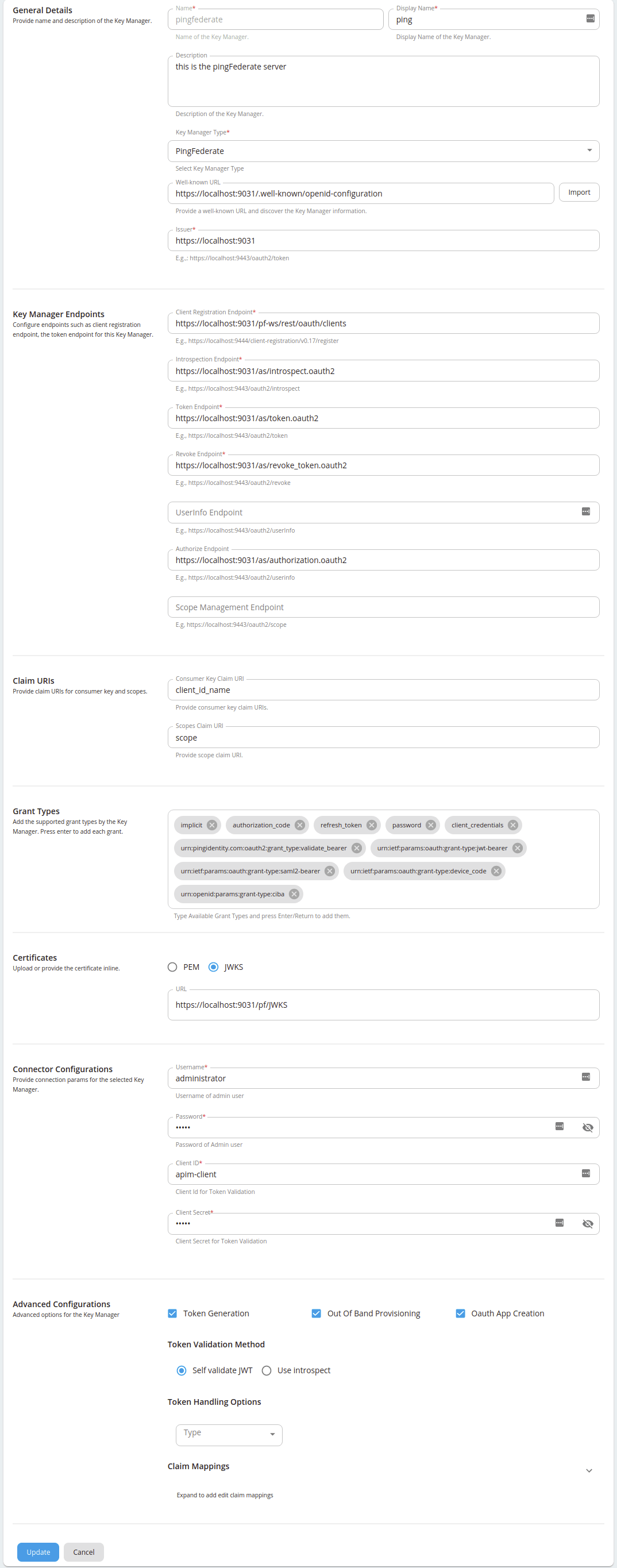 Configuration Description Name The name of the authorization server. Mandatory Display Name A name to display on the UI. Mandatory Description A brief description of the Key Manager. Optional Key Manager Type The type of Key Manager to be selected. Mandatory Well-known-url The well-known URL of the authorization server (Key Manager). If the well-known URL is provided, other endpoints can be imported. Optional Issuer The issuer that consumes or validates the access tokens Example: https://localhost:9031 https://localhost:9031 Mandatory Key Manager Endpoints Client Registration Endpoint The endpoint to verify the identity and obtain profile information of the end-user based on the authentication performed by an authorization server. Example: https://localhost:9031/pf-ws/rest/oauth/clients Mandatory Introspection Endpoint The endpoint that allows authorized protected resources to query the authorization server to determine the set of metadata for a given token that was presented to them by an OAuth client. Example: https://localhost:9031/as/introspect.oauth2 Mandatory Token Endpoint The endpoint that issues the access tokens. Example: https://localhost:9031/as/token.oauth2 Mandatory Revoke Endpoint The endpoint that revokes the access tokens. Optional Userinfo Endpoint The endpoint that allows clients to verify the identity of the end-user based on the authentication performed by an authorization server, as well as to obtain basic profile information about the end-user. Optional Authorize Endpoint The endpoint that is used to obtain an authorization grant from the resource owner via user-agent redirection. Optional Scope Management Endpoint The endpoint that is used to manage the scopes. Optional Connector Configurations Username The Administrative user's username to invoke the client registration endpoint. Mandatory Client Secret The Administrative user's password to invoke the client registration endpoint. Mandatory Client ID The client ID obtained from PingFederate to validate tokens from Introspection endpoint Mandatory Client Secret The client secret obtained from PingFederate to validate tokens from Introspection endpoint. Mandatory Claim URIs Provide the claim URIs for the consumer key and the scopes. Consumer Key Claim URI The claim URI for the consumer key. Optional Scopes Claim URI The claim URI for scopes. Optional Grant Types The supported grant types. Optional Certificates PEM Either copy and paste the certificate in PEM format or upload the PEM file. Optional JWKS The JSON Web Key Set (JWKS) endpoint is a read-only endpoint. This URL returns PingFederate's public key set in JSON web key set format. This contains the signing key(s) the Relying Party (RP) uses to validate signatures from PingFederate. Optional Permissions Key Manager Permission Permission type for role-based Key Manager restriction. e.g., PUBLIC,ALLOW,DENYOptional Roles Roles to Whitelist or Blacklist Optional Advanced Configurations Token Generation Token Generation Enables token generation via the authorization server. Optional Out Of Band Provisioning This enables the provisioning of Auth clients that have been created without the use of the Developer Portal, such as previously created Auth clients. Optional Oauth App Creation This enables the creation of Auth clients. Optional Token Validation Method The method used to validate the JWT signature. Self Validate JWT The kid value is used to validate the JWT token signature. If the kid value is not present, gateway_certificate_aliasis used.Optional Use introspect The JWKS endpoint is used to validate the JWT token signature. If this option is used to validate the tokens it is mandatory to add a Token Handling Option. For the PingFederate it should be JWT and it is required to specify a claim mapping as a unique identifier. Example: Claim Key : iss Claim Value : https://localhost:9031 Optional Token Handling Options Provides a way to validate the token for this particular authorization server. This is mandatory if the Token Validation Method is introspect REFERENCE The tokens matching a specific regular expression (regEx) is validated. Optional JWT The tokens matching a specific JWT is validated. Optional CUSTOM The token matching a custom pattern is validated. Optional Claim Mappings Local and remote claim mapping. Optional