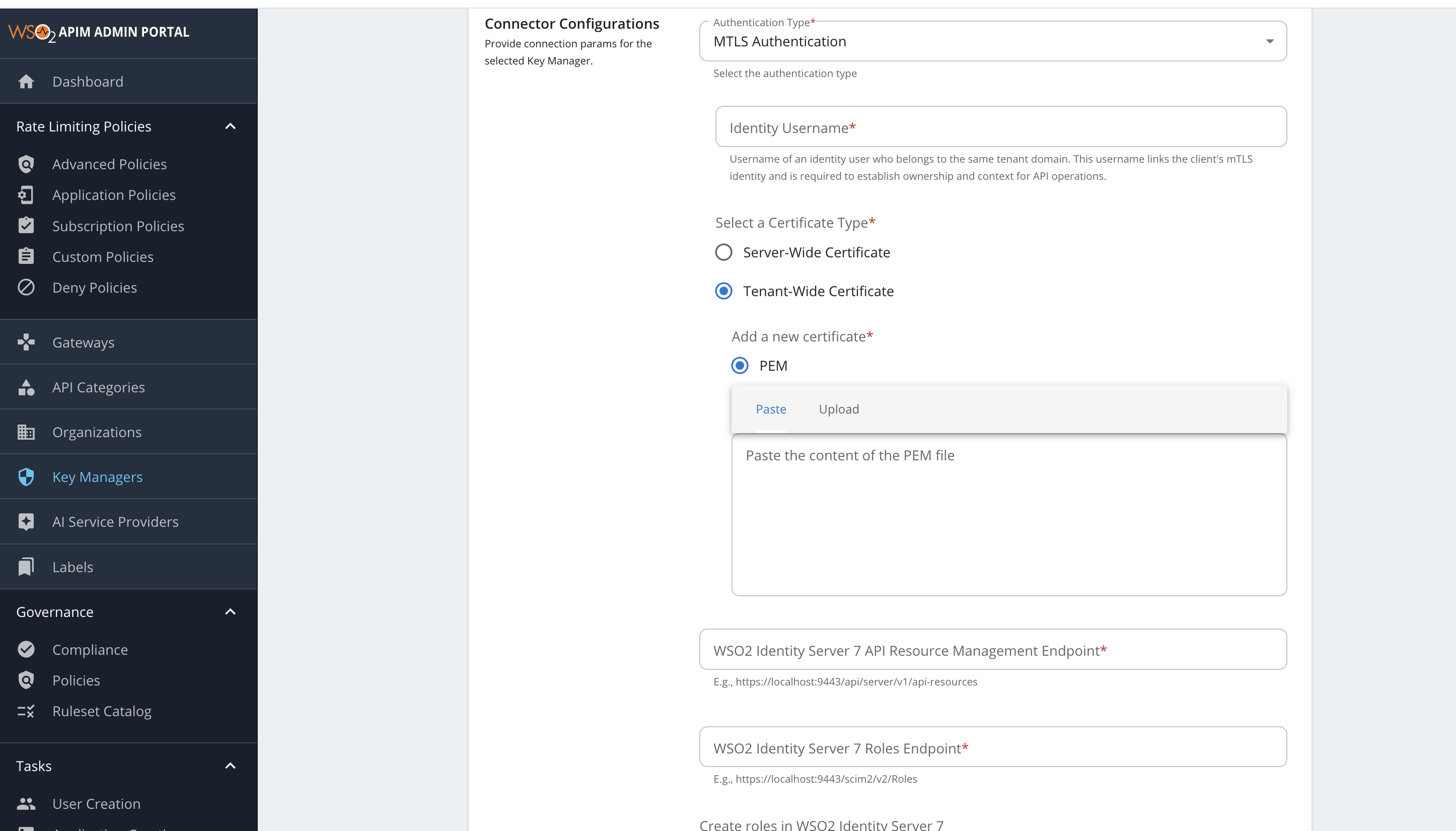 https://localhost:9444/scim2/Me. The auto-import populates this field withhttps://localhost:9444/oauth2/userInfo.Configuration Value Issuer https://localhost:9444/oauth2/tokenClient Registration Endpoint https://localhost:9444/api/identity/oauth2/dcr/v1.1/registerIntrospection Endpoint https://localhost:9444/oauth2/introspectToken Endpoint https://localhost:9444/oauth2/tokenDisplay Token Endpoint https://localhost:9444/oauth2/tokenRevoke Endpoint https://localhost:9444/oauth2/revokeDisplay Revoke Endpoint https://localhost:9444/oauth2/revokeUserInfo Endpoint https://localhost:9444/scim2/MeAuthorize Endpoint https://localhost:9444/oauth2/authorizeScope Management Endpoint https://localhost:9444/api/identity/oauth2/v1.0/scopes* Under Grant types, provide all the following: password,client_credentials,refresh_token,urn:ietf:params:oauth:grant-type:saml2-bearer,iwa:ntlm,urn:ietf:params:oauth:grant-type:device_code,authorization_code,urn:ietf:params:oauth:grant-type:jwt-bearer,urn:ietf:params:oauth:grant-type:token-exchange.* Under Certificates section, select JWKS. Enter https://localhost:9444/oauth2/jwksas the URL.* Under Connector Configurations, provide the following values: Configuration Value Authentication Type API Manager supports either Basic Authentication (username, password) or Mutual SSL (using server wide certificate or tenant wide certificate). Identity Username (for Mutual SSL only) You must provide the tenant-qualified username of a user in WSO2 IS 7.x, belonging to the same tenant domain, who has the required permissions to invoke the DCR, Introspection, API Resource Management, and Roles APIs. The WSO2 IS 7.x uses this user to perform authorization when processing related requests. Certificate Type (for Mutual SSL only) - Server-wide: Uses an existing certificate trusted by both API Manager and WSO2 IS 7.x truststores.