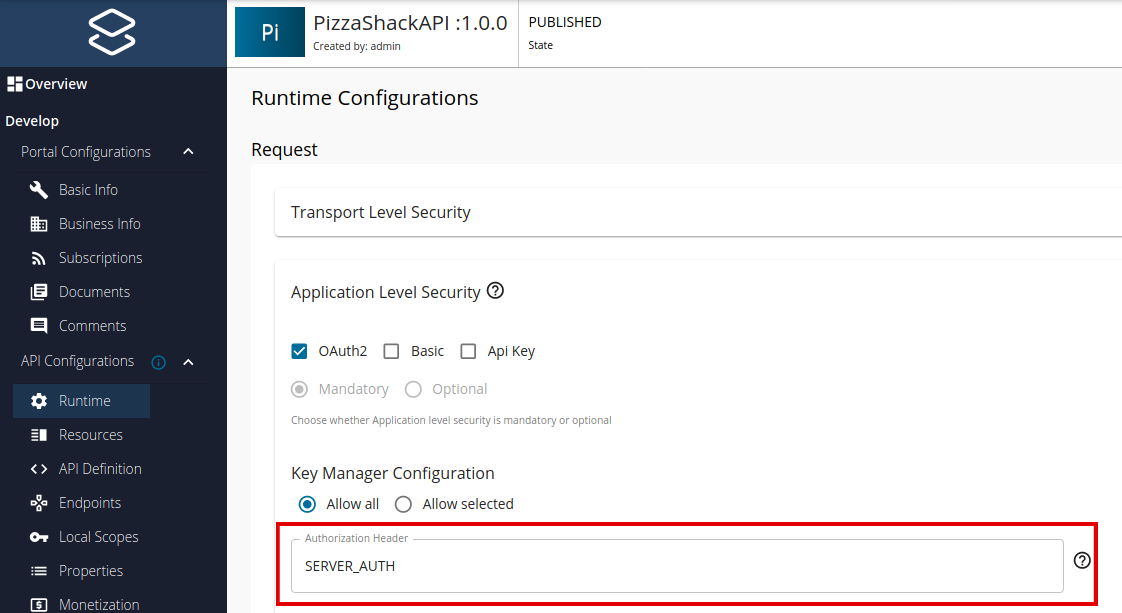 The API Publisher application allows an API Developer or Product Manager to specify the name of the authorization header when creating or modifying an API.