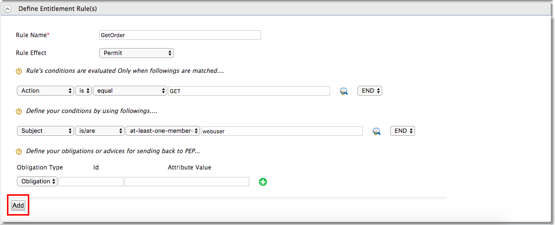 Conditions: Under Rule's conditions are evaluated...... , select drop down options as Action , is , equal in order and enter GET in the last field. Under Define your conditions by using followings.... , select drop down options as Subject , is/are , at-least-one-member-of in order and enter webuser in the last field. Click the icon next to END shown below to configure the attribute value and attribute source to retrieve the user roles from the user store.