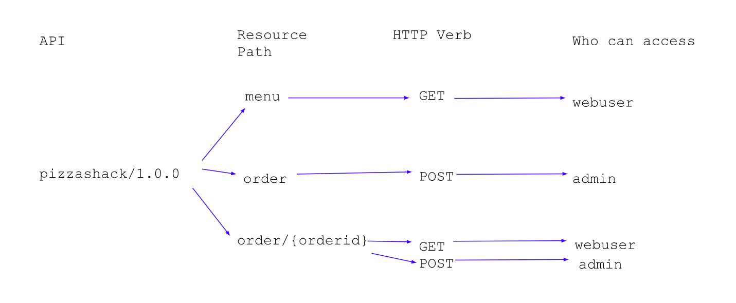 Based on the requirement, a single API is exposed to add or retrieve order information. Each member type (webuser or admin) is identified from the resource path. The operation (GET or POST) that needs to be performed is distinguished by the HTTP verb. Follow the steps below to implement this kind of role-based access control.