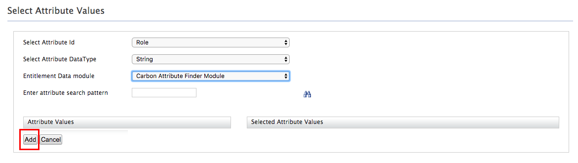 Conditions: Under Define your conditions by using followings.... , select drop down options as Subject , is/are , at-least-one-member-of in order and enter admin in the last field. Click the icon next to END shown below to configure the attribute value and attribute source to retrieve the user roles from the user store.