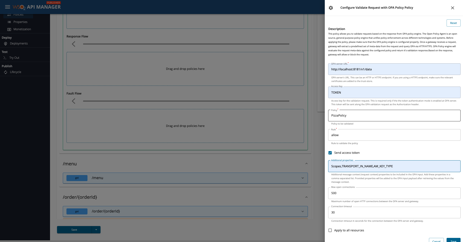 | Additional Properties | Optional Additional message context (request context) properties to be included in the OPA input. Provided property names will be added to the OPA input payload with the value obtained from the message context. Add these properties in a comma separated list. | Scopes,TRANSPORT_IN_NAME,AM_KEY_TYPE |